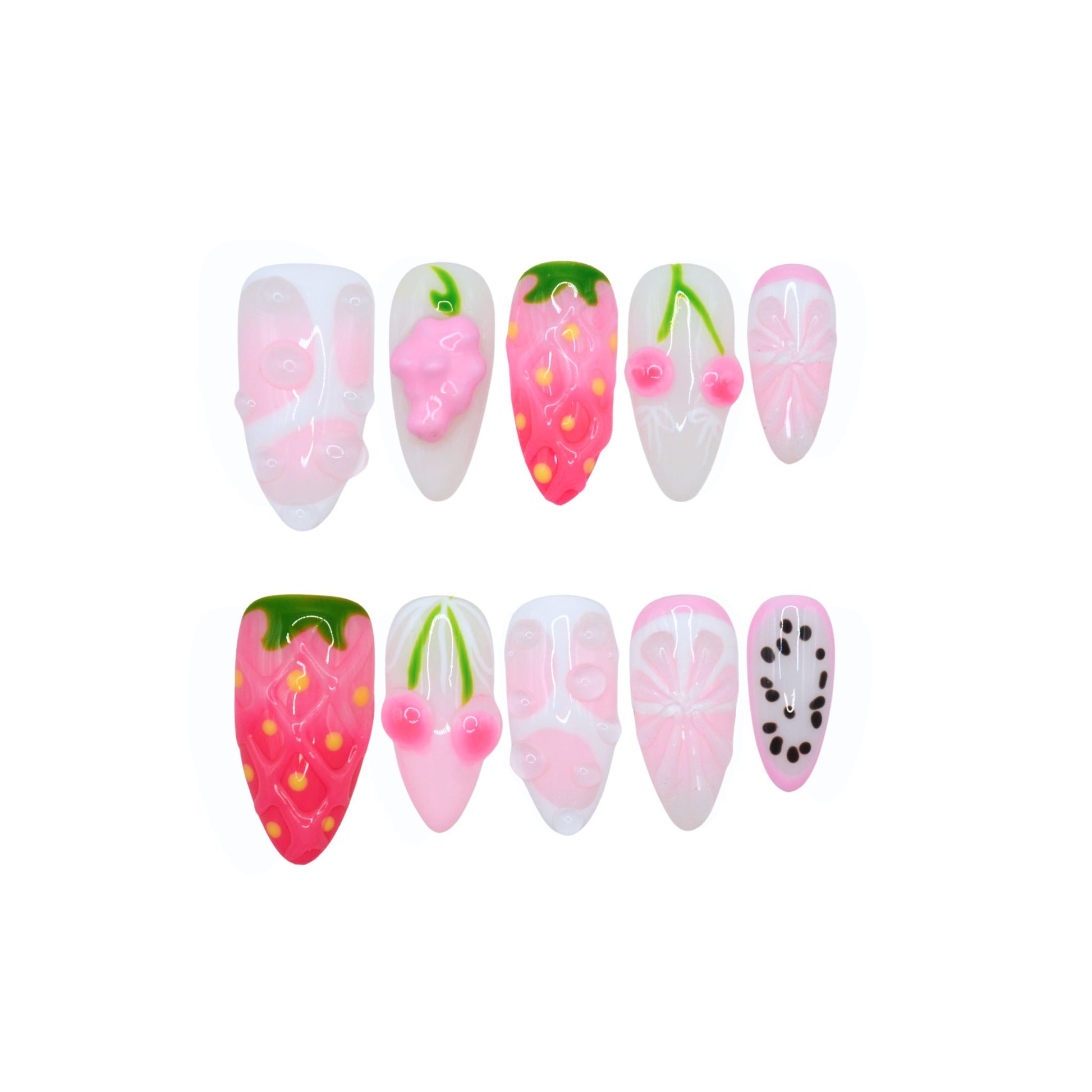 This premium set features an almond shape with a translucent white base. Some nails are adorned with 3D pink strawberries featuring green tops and yellow seeds, while others display pink cherries with green stems. Additional designs include abstract fruit patterns resembling oranges or watermelons, accented with black spots. The glossy finish enhances the playful and fruity aesthetic.