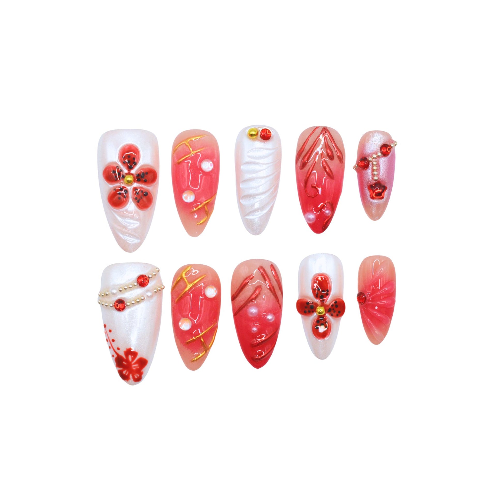 This premium set features an almond shape with a gradient design transitioning from a nude base to a soft red tip. Some nails are adorned with delicate white floral patterns and small red gemstones, while others feature a subtle glitter accent. The glossy finish enhances the gentle and sophisticated look.