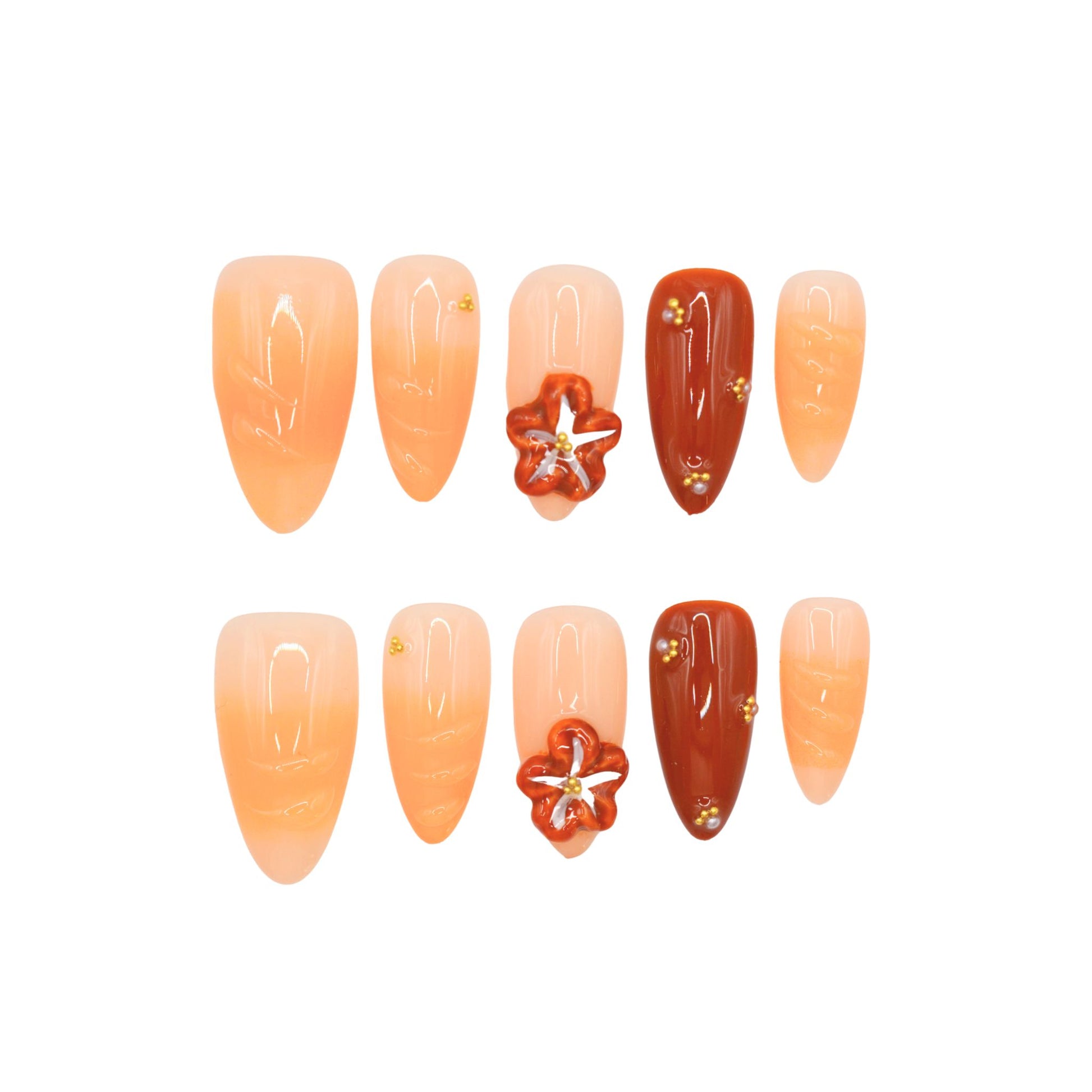 This premium set features an almond shape with a gradient base transitioning from nude to soft peach tones, with some nails showcasing a rich brown hue. Several nails are adorned with 3D orange floral embellishments and scattered gold bead accents. The overall style is warm and elegant, blending subtle gradients with delicate decorative elements.