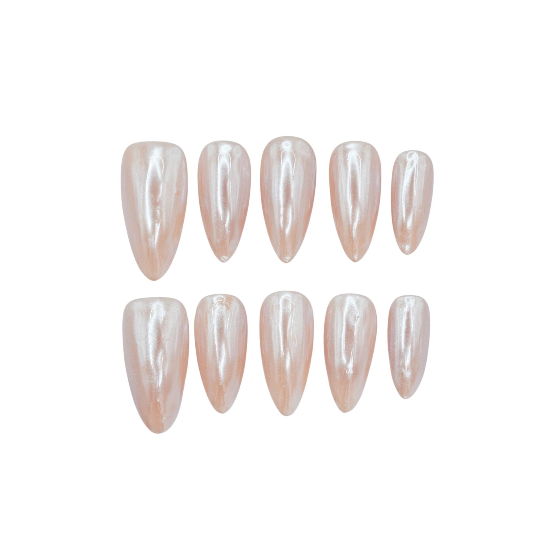 This premium set features, an almond-shaped design with a glossy, pearlescent caramel color with an almond shape and rounded tips. The shiny, iridescent finish suggests they are designed as press-on nails or a sample for a shimmering, elegant manicure style.