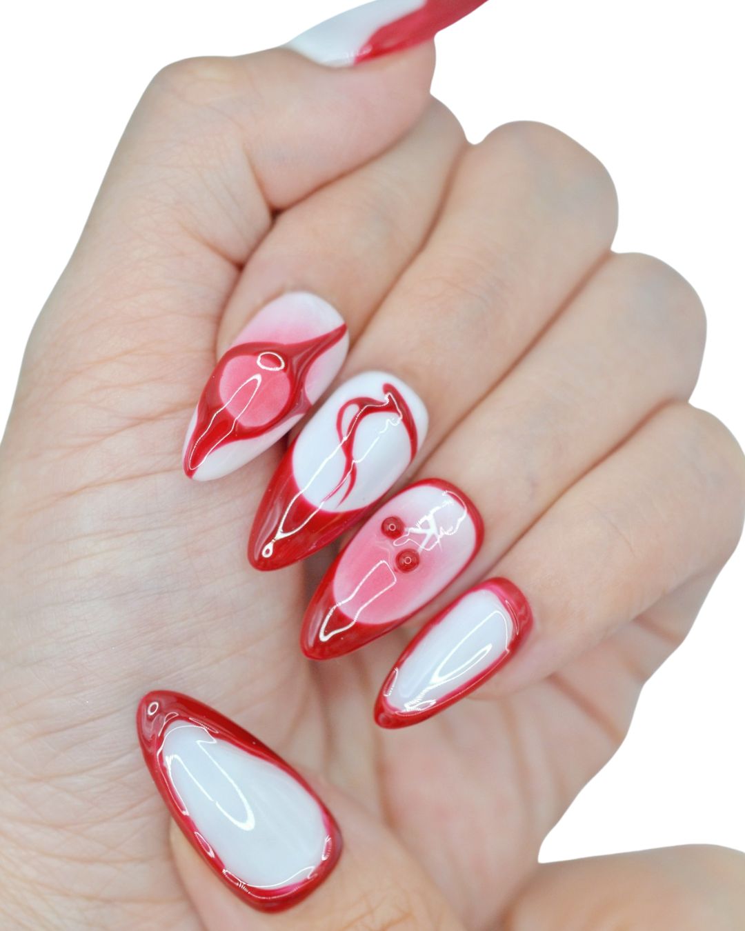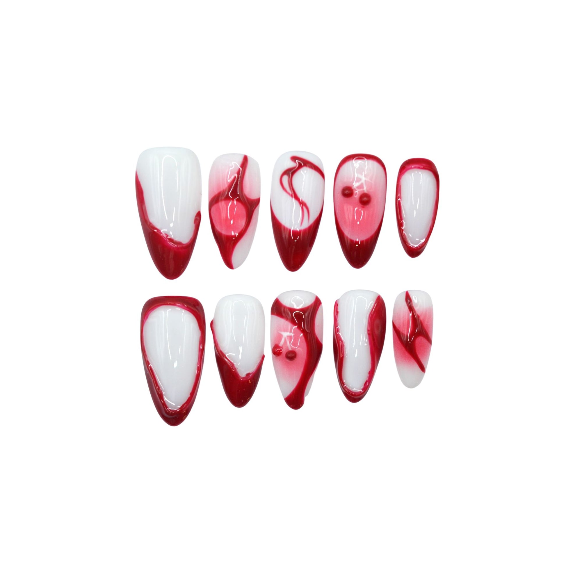This premium set features an almond-shaped design with a playful twist. Featuring a nude base and bold cherry-red accents, the design is brought to life with irregular line details and charming cherry embellishments. Sophisticated yet fun, these press-on nails add a touch of sweetness and confidence to any look.