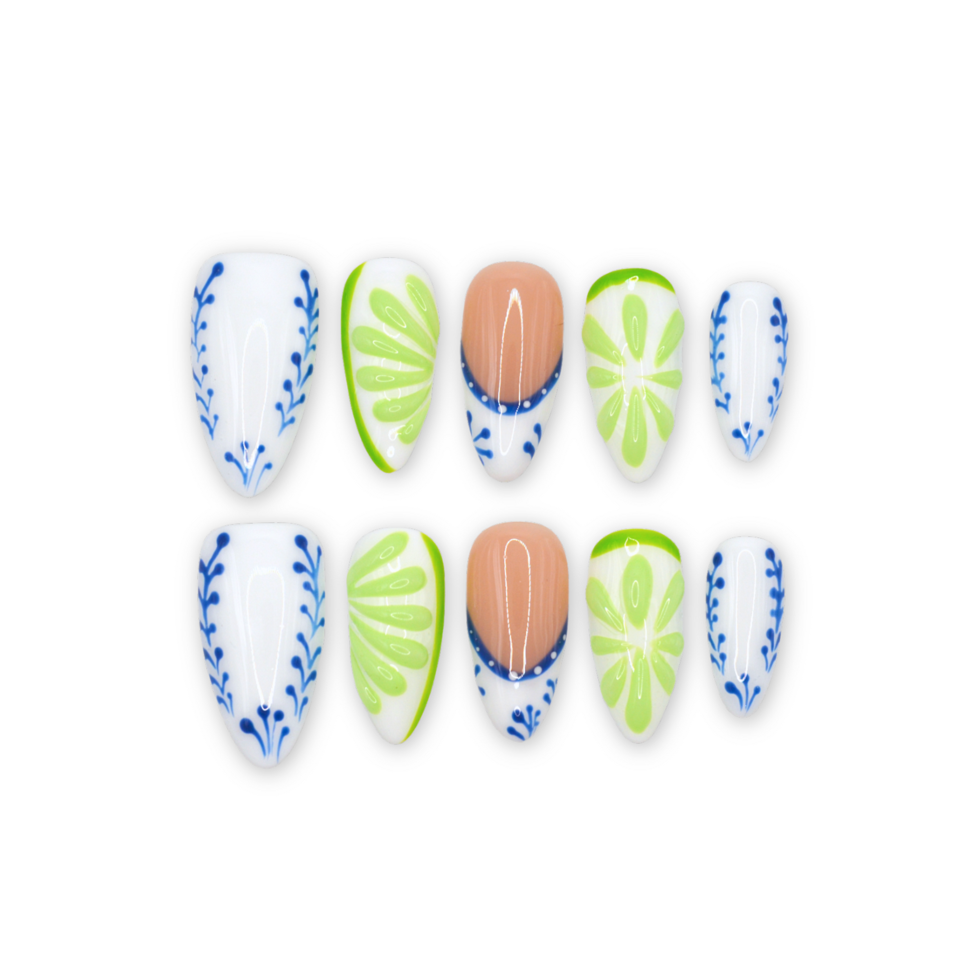 This premium set features an almond shape with a white base accented by intricate blue floral and vine patterns. Some nails incorporate a gradient nude base with a blue tip, while others are adorned with vibrant green floral designs resembling citrus slices or petals. The glossy finish enhances the delicate and colorful artistry of the overall look.