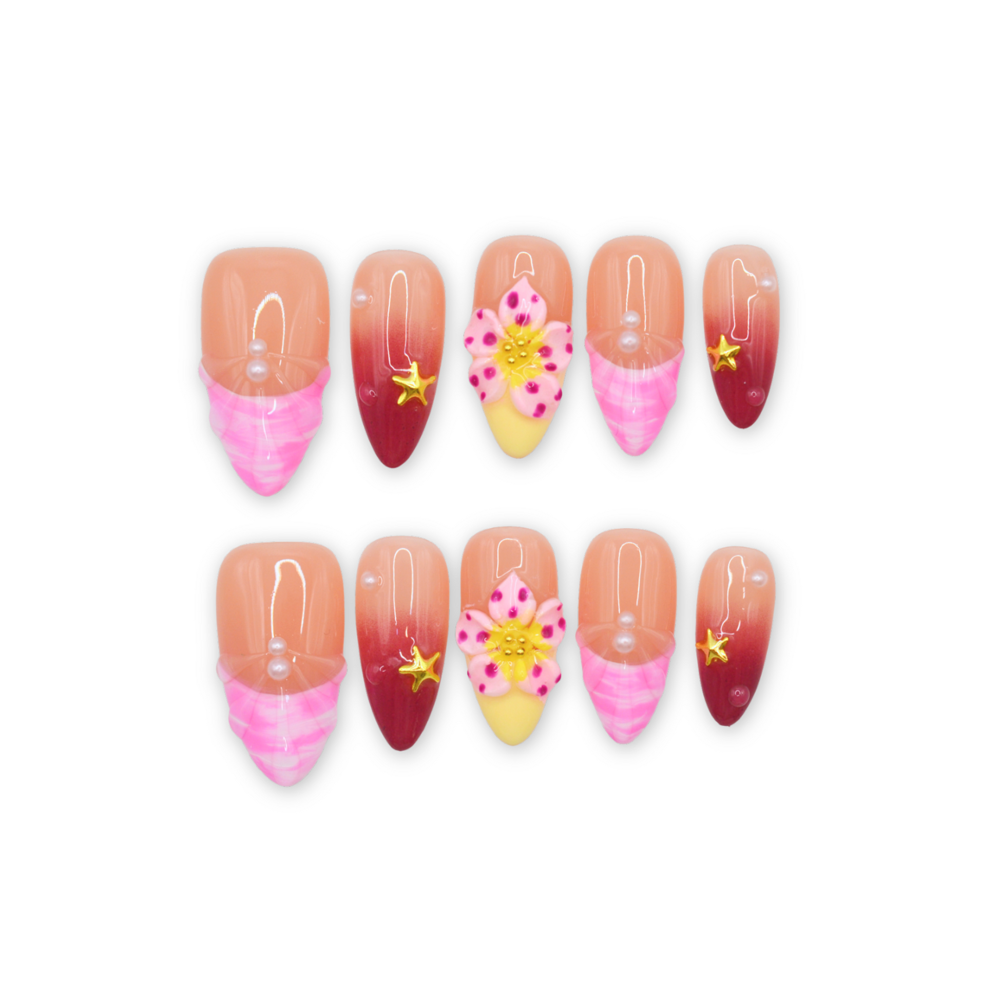 This premium set features a stylish almond shape with a gradient design transitioning from a soft nude base to a rich red or pink tip. Some nails are adorned with a pink and white tie-dye pattern near the base. Decorative elements include 3D pink floral accents with yellow centers, gold star embellishments, and small pearls, adding a playful yet elegant touch. The glossy finish enhances the vibrant and intricate design.