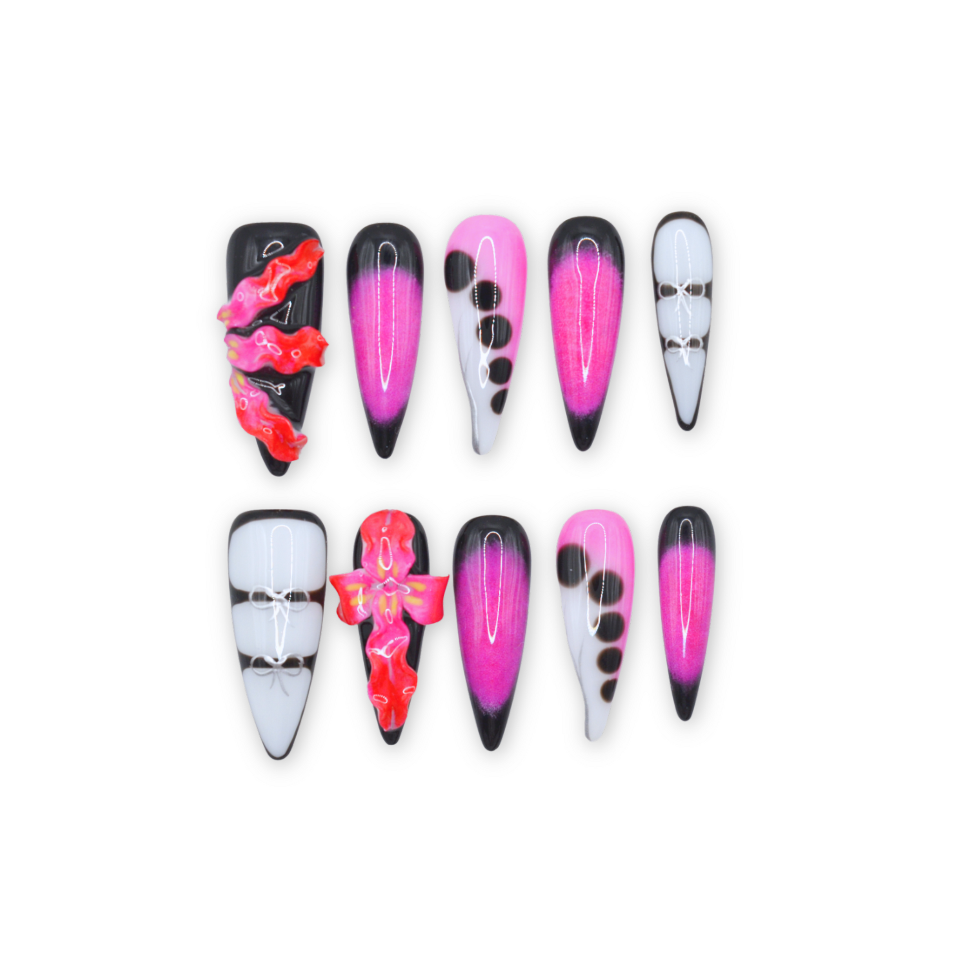 This premium set features a stiletto shape with a striking design. They have a black base with a gradient transitioning to bright pink tips. Some nails are adorned with white sections featuring black polka dots, while others are decorated with 3D pink and red bow-shaped accents. The glossy finish enhances the bold and playful aesthetic.