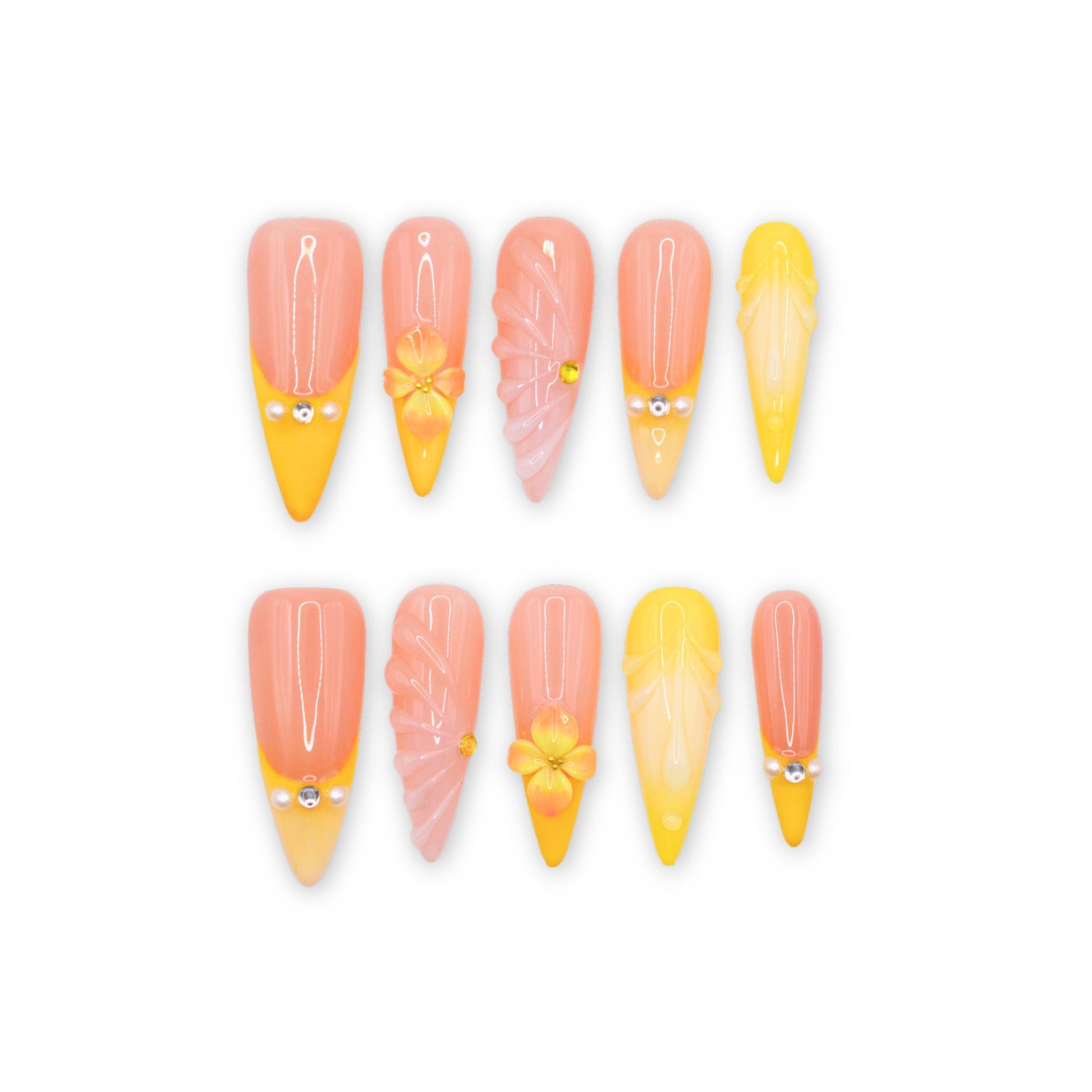 This premium set features a stiletto shape with a gradient design transitioning from a nude base to a vibrant coral tip. Some nails are adorned with 3D yellow floral accents featuring yellow centers, while others are decorated with small coral-white beads. The glossy finish enhances the bright and elegant look.