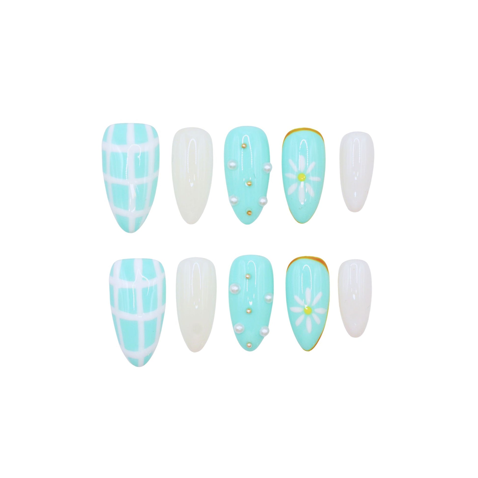 This premium set features an almond shape with a light blue and white color scheme, with some nails showcasing a checkered pattern and others adorned with 3D daisy flowers in yellow and white. Several nails also have pearl-like embellishments along the edges or center. The overall style is fresh and playful, evoking a summery or garden-inspired theme.