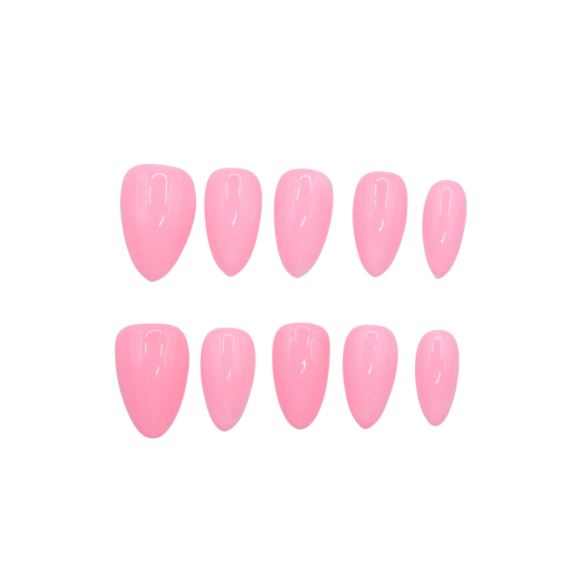 This premium set features a short, almond-shaped design with a glossy, vibrant pink color with an almond shape and rounded tips. The shiny finish suggests they are designed as press-on nails or a sample for a bold, playful manicure style.