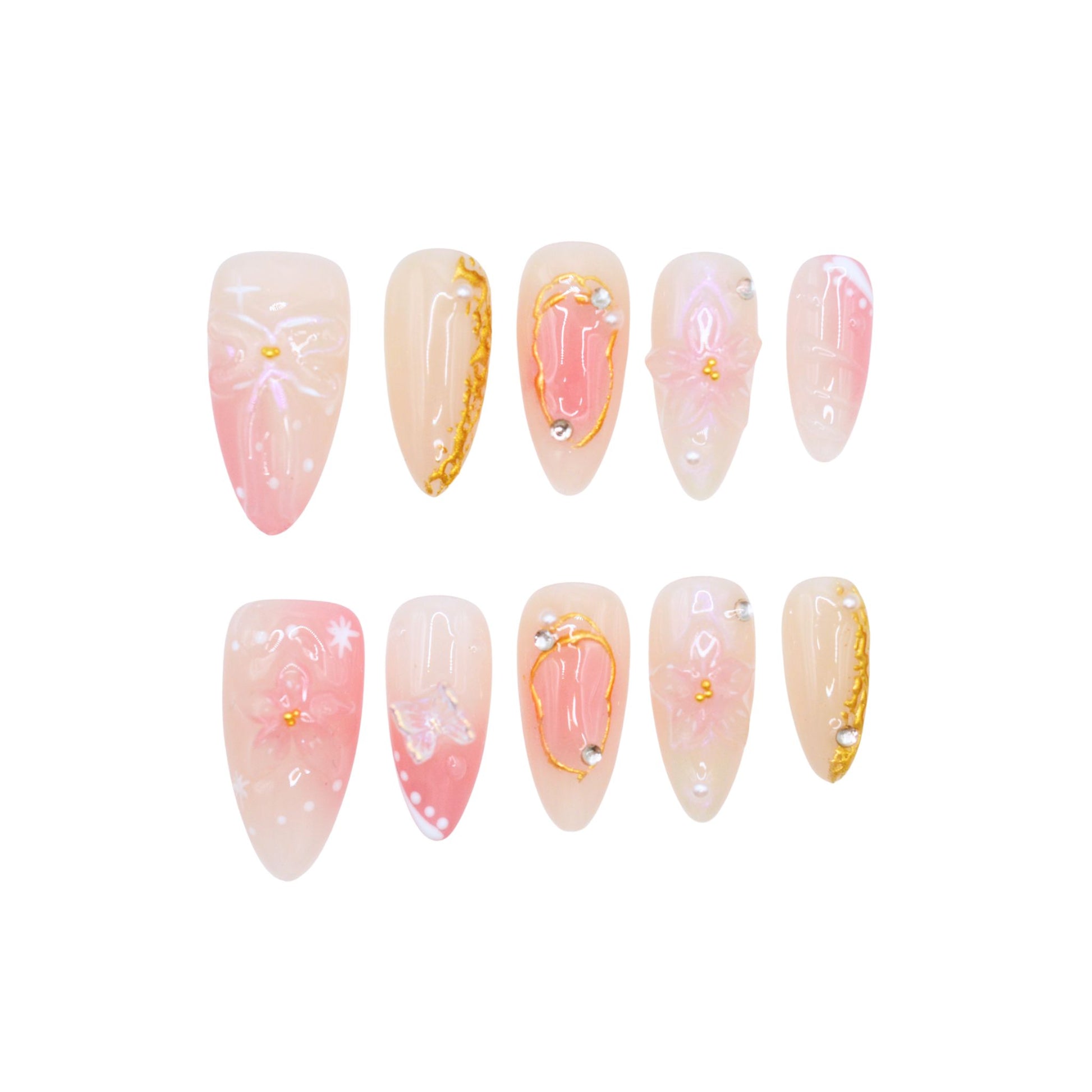 This premium set features an almond shape with a glossy, iridescent finish in soft peach and pink tones. The nails are adorned with intricate 3D decorations, including floral designs, bows, and butterflies, accented with gold outlines, pearls, and rhinestones. Some nails feature subtle white polka dots and metallic gold detailing, creating a delicate and luxurious aesthetic.