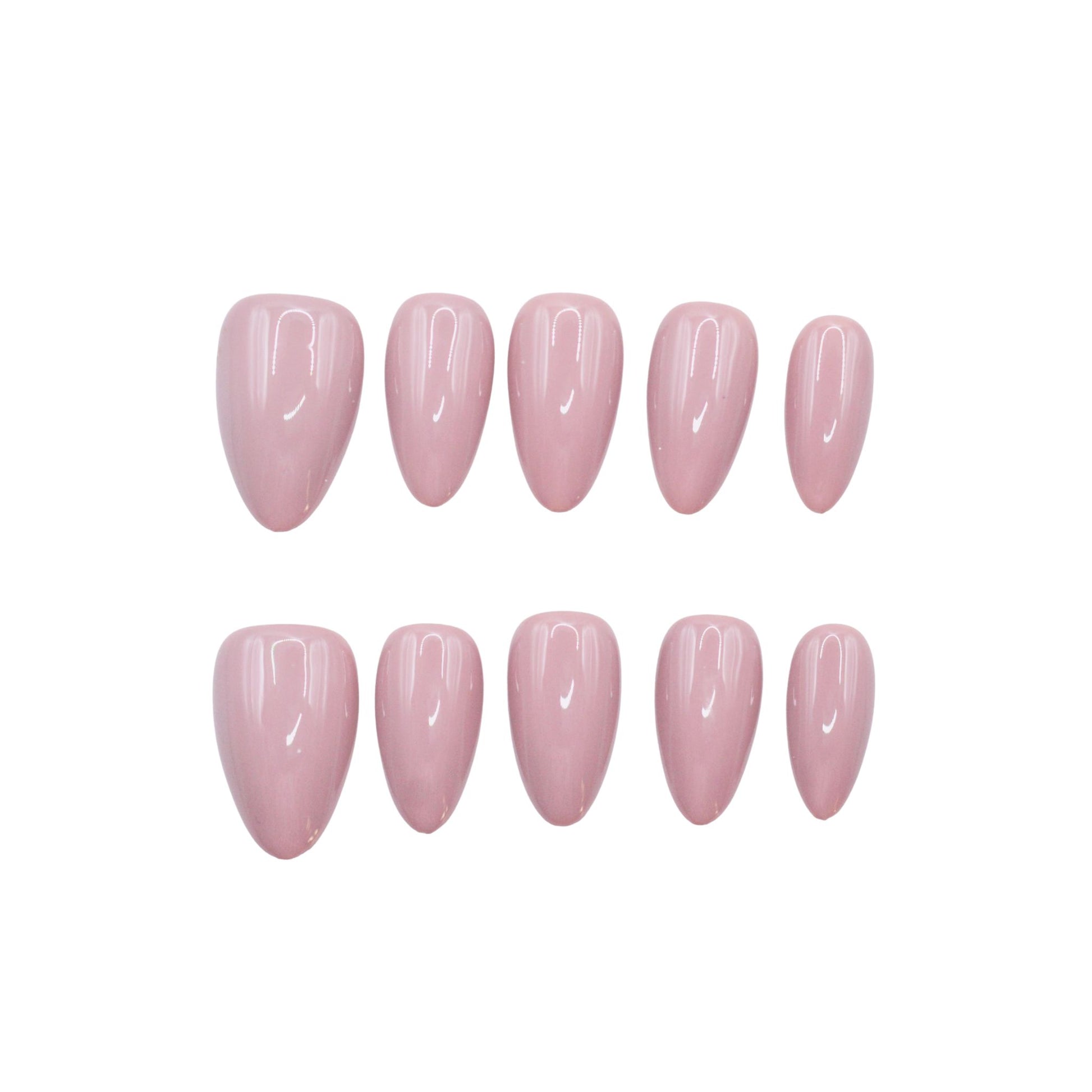 This premium set features a short, almond-shaped design with a glossy, soft mauve pink color with an almond shape and rounded tips. The shiny finish suggests they are designed as press-on nails or a sample for a subtle, elegant manicure style.