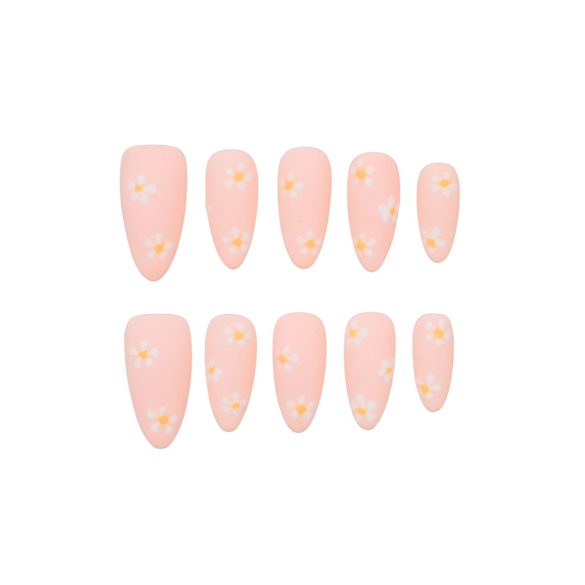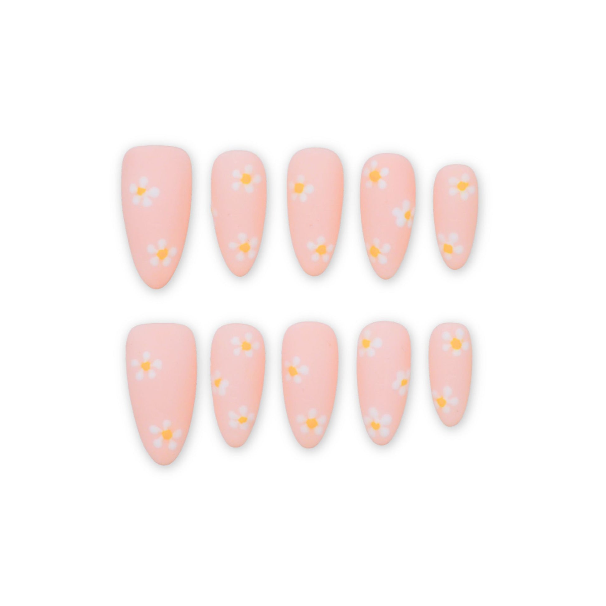 This premium set features an almond shape with a soft pink base with a matte finish, adorned with small yellow and white daisy-like flower designs scattered across them. The overall style is delicate and playful, evoking a summery or floral theme.