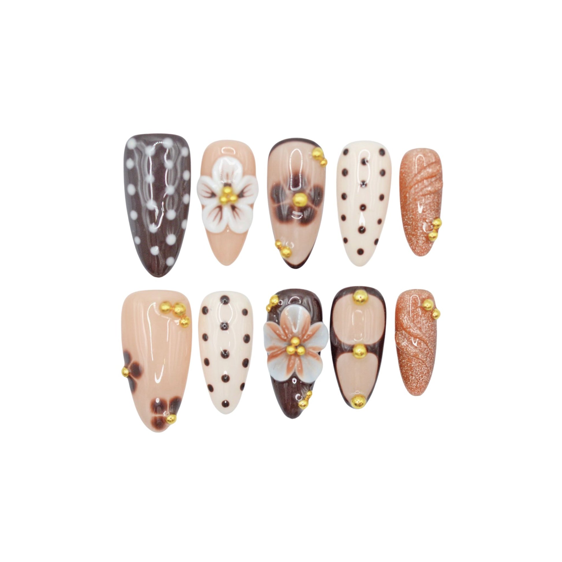 This premium set features a short, almond-shaped design with warm, brown tones enhanced by playful polka dots, creating a refined yet adventurous look. The French and gradient designs blend seamlessly for a soft, natural charm, while 3D floral accents and gold bead embellishments add a touch of luxury.
