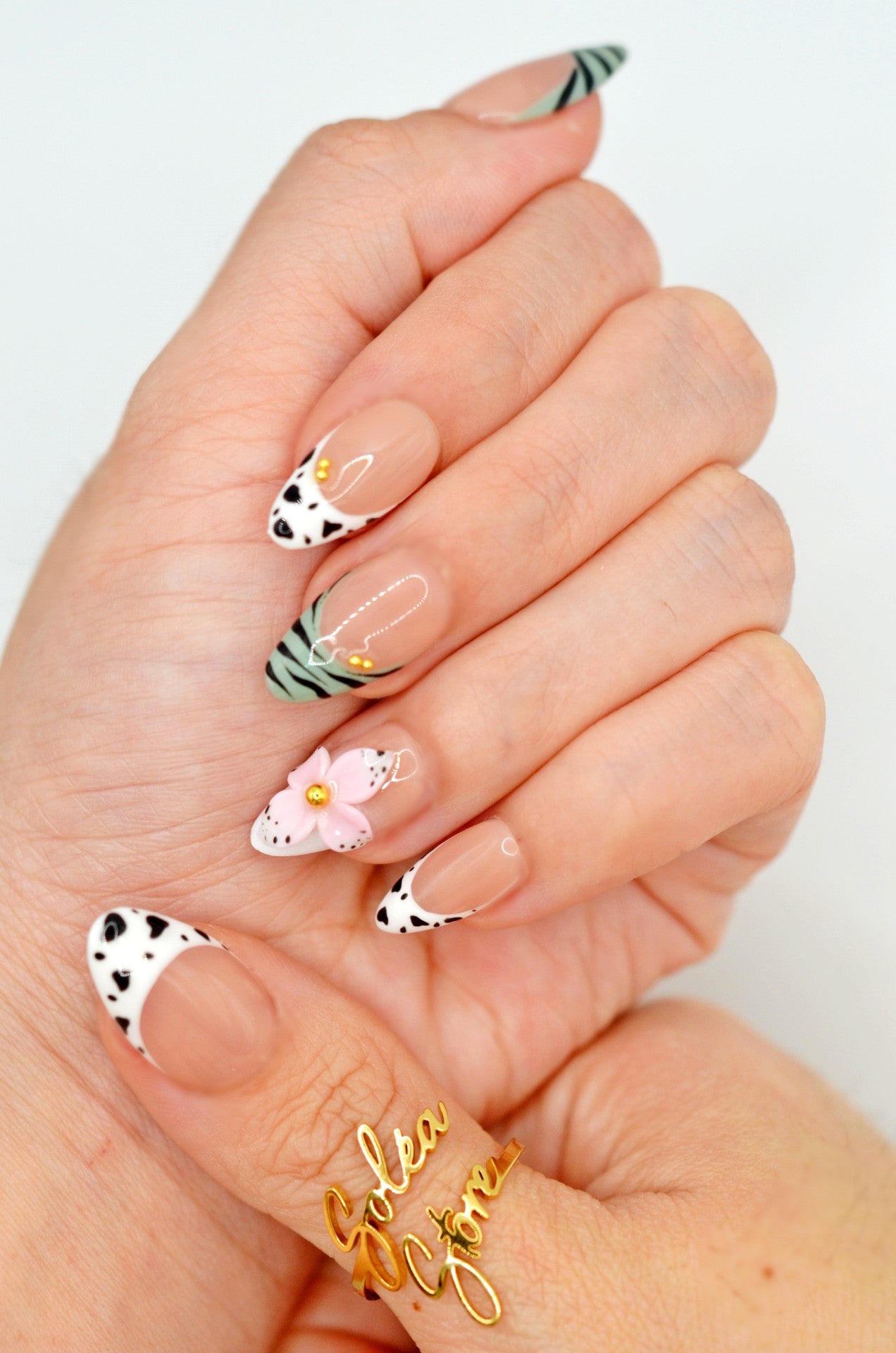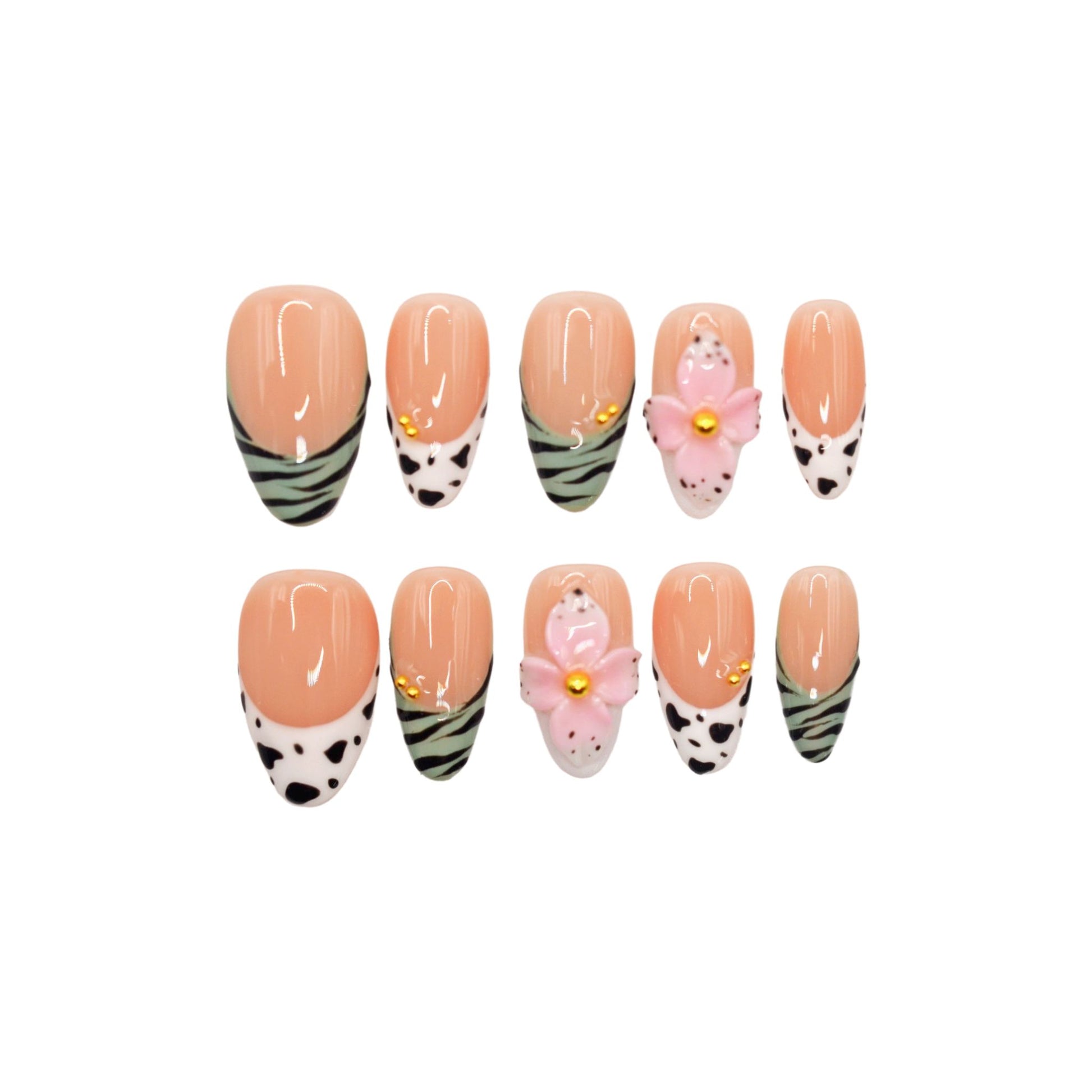 This premium set features, an almond-shaped design with a whimsical and eclectic design, blending soft nude and pink bases for a natural look. The tips feature playful animal-inspired patterns, including green-and-black zebra stripes and black-and-white cow spots, adding a fun, quirky edge. Accents include 3D pink flower charms with gold centers and small gold beads or dots for a touch of sparkle. The overall aesthetic is cute, adventurous, and cozy in a lighthearted way, reminiscent of a mix between safari vibes and sweet floral elements. Perfect for someone wanting a bold yet approachable manicure. If you have more images or want ideas on recreating this, let me know!