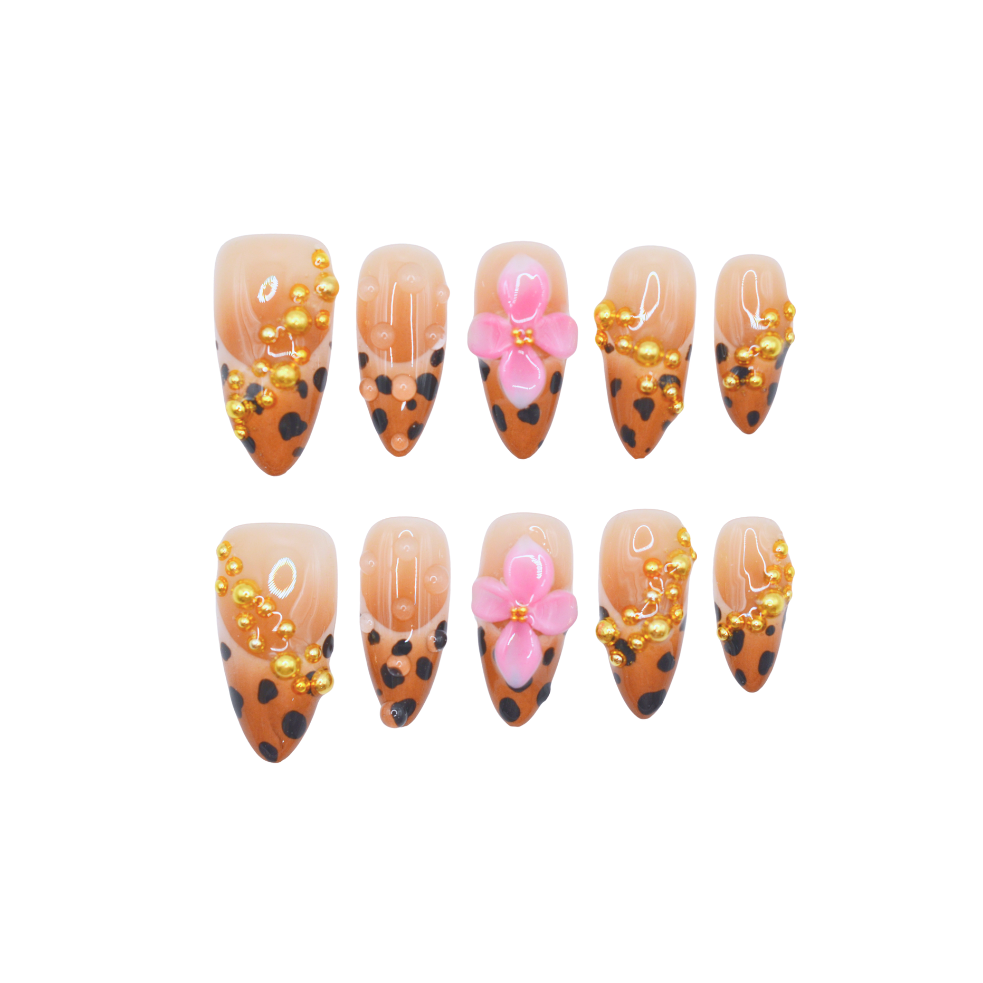 This premium set features an almond shape with a gradient design transitioning from a nude base to a brown tip, accented with a leopard-spot pattern in black and brown. Some nails are adorned with 3D pink floral accents featuring yellow centers, while others are decorated with clusters of gold beads and pearls. The glossy finish enhances the bold and luxurious look.