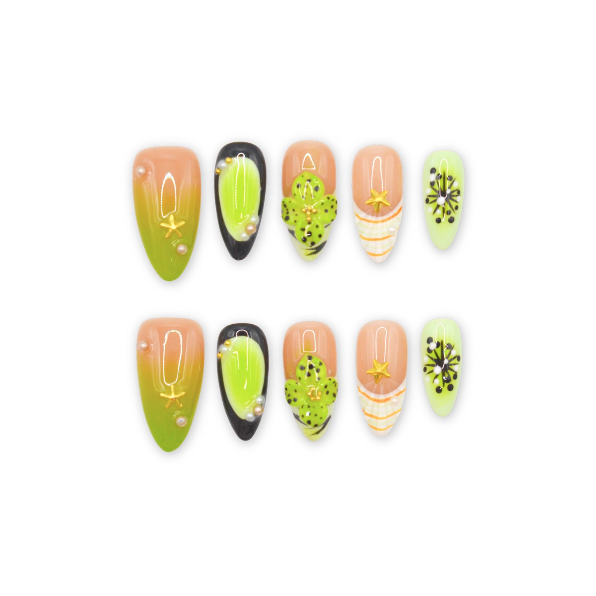 This premium set features an almond shape with a gradient effect transitioning from nude or peach at the base to bright green tips, with some nails incorporating black accents. Decorative elements include 3D floral designs in green with black spots, gold starfish and star motifs, pearl accents, and striped patterns in orange and white. The overall look is colorful and whimsical, ideal for a fun and eye-catching manicure.