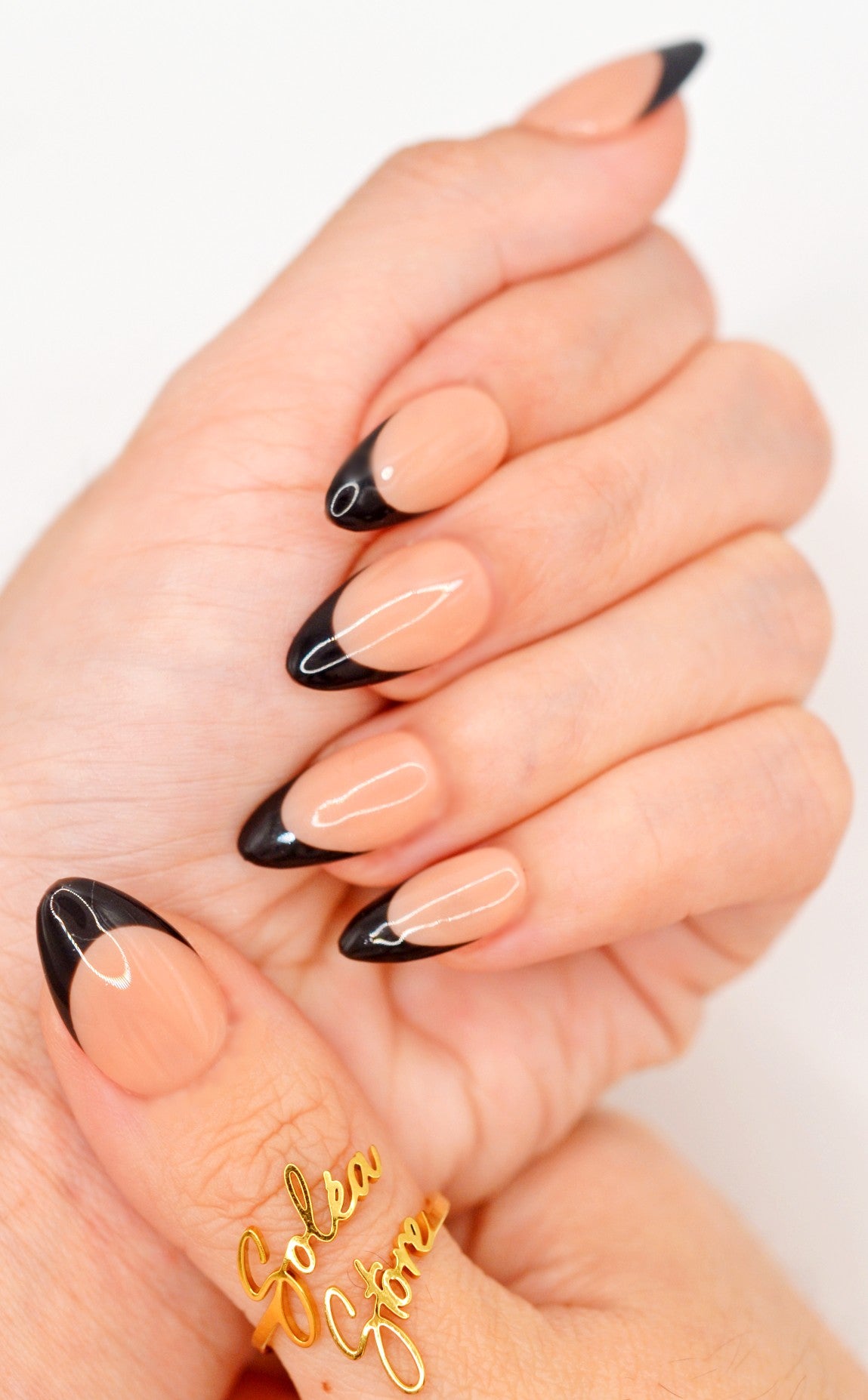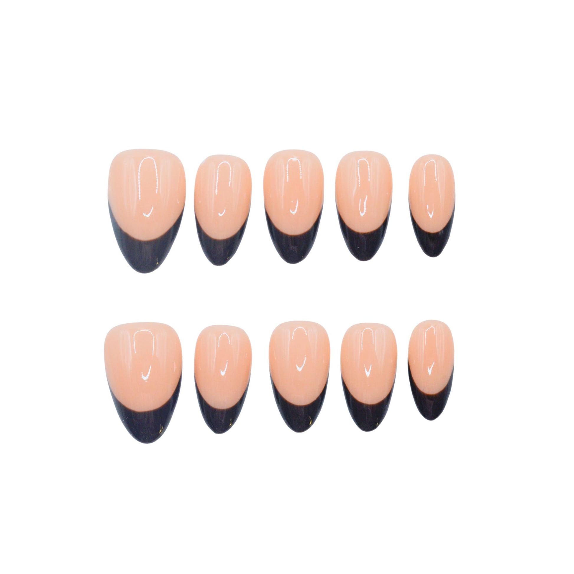 This premium set features, an almond-shaped design with a glossy finish with a reverse French manicure design, where the tips are painted in a deep black and the bases are a soft nude or peach color. The almond shape with rounded tips suggests they are designed as press-on nails or a sample for a chic, contrasting manicure style.
