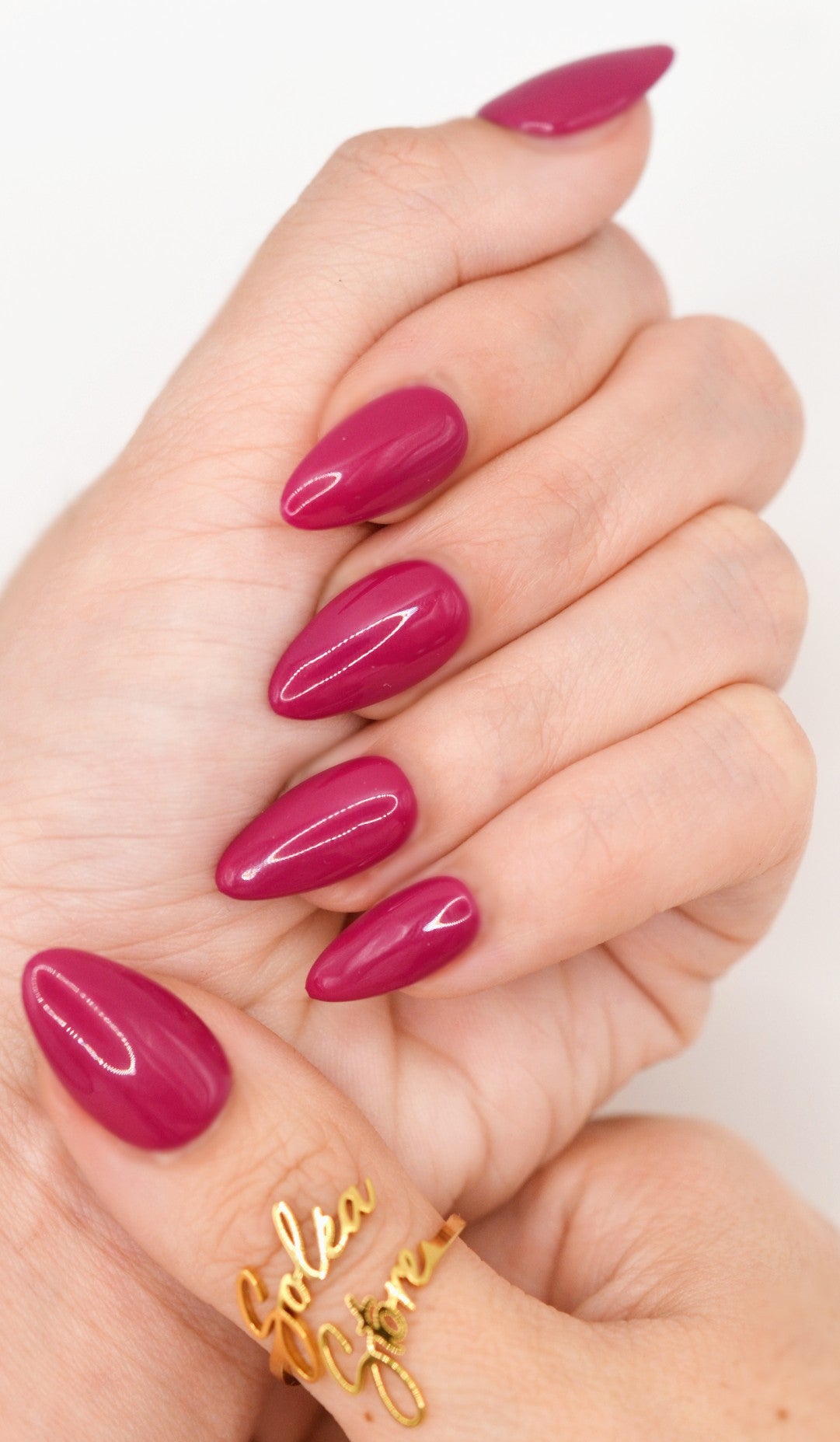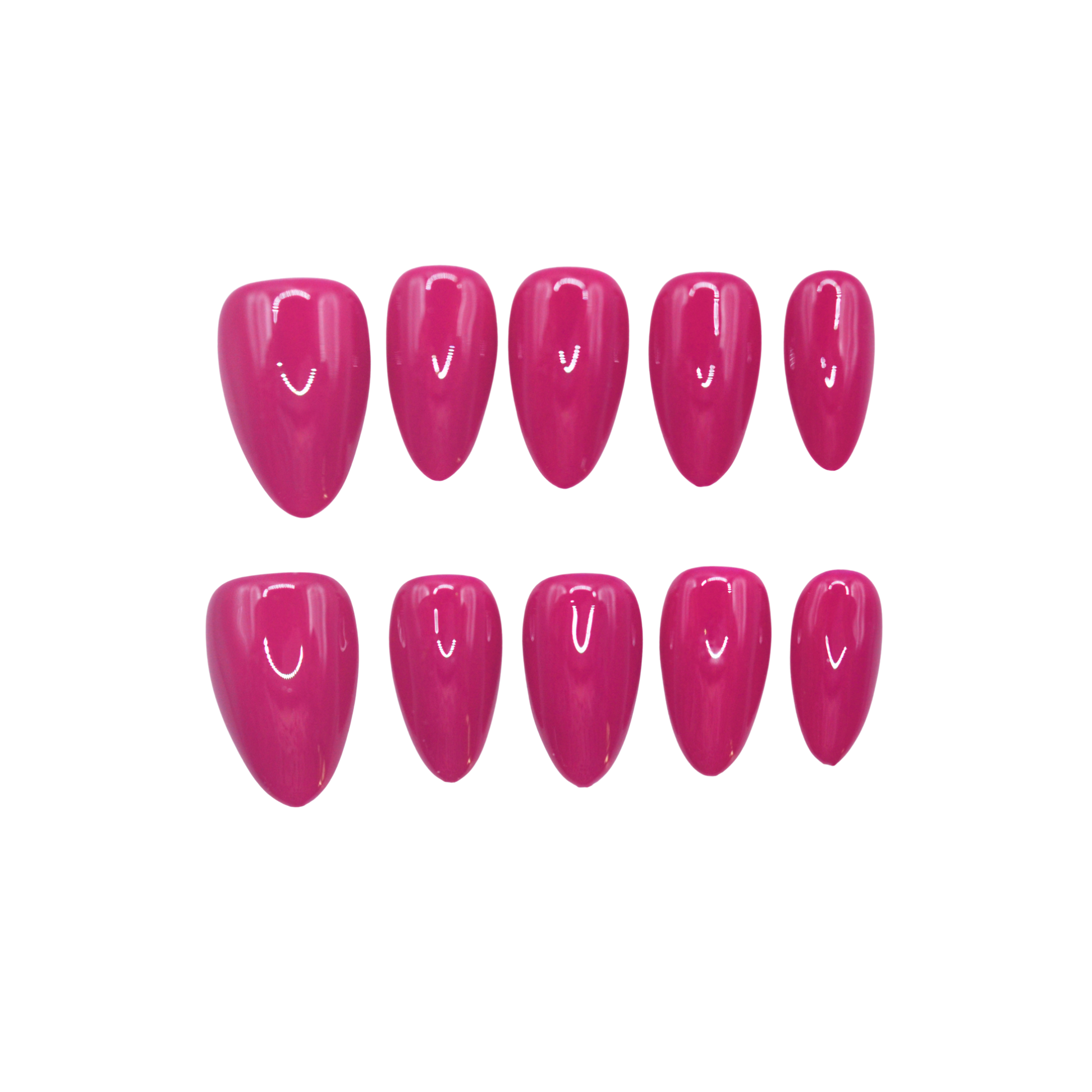 This premium set features a short, almond-shaped design with a glossy, vibrant magenta color with an almond shape and rounded tips. The shiny finish suggests they are designed as press-on nails or a sample for a bold, eye-catching manicure style.