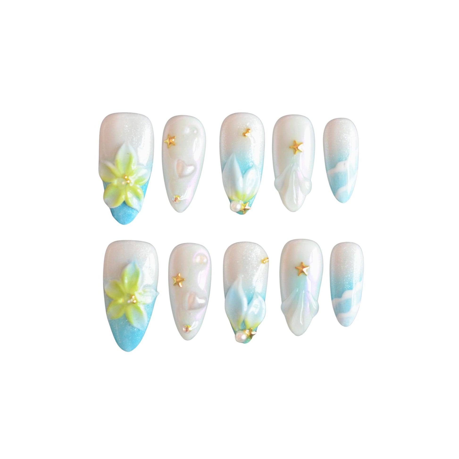 This premium set features, an almond-shaped design with a gradient base transitioning from white to light blue, resembling a soft sky with wispy clouds. Decorative elements include 3D yellow and green floral accents with gold bead centers, pearl-like dots, and small gold star charms. Some nails have textured wave or shell patterns, enhancing the ethereal, airy vibe. The overall look is delicate, whimsical, and cozy, perfect for a serene, celestial aesthetic. Let me know if you'd like styling ideas or more details!