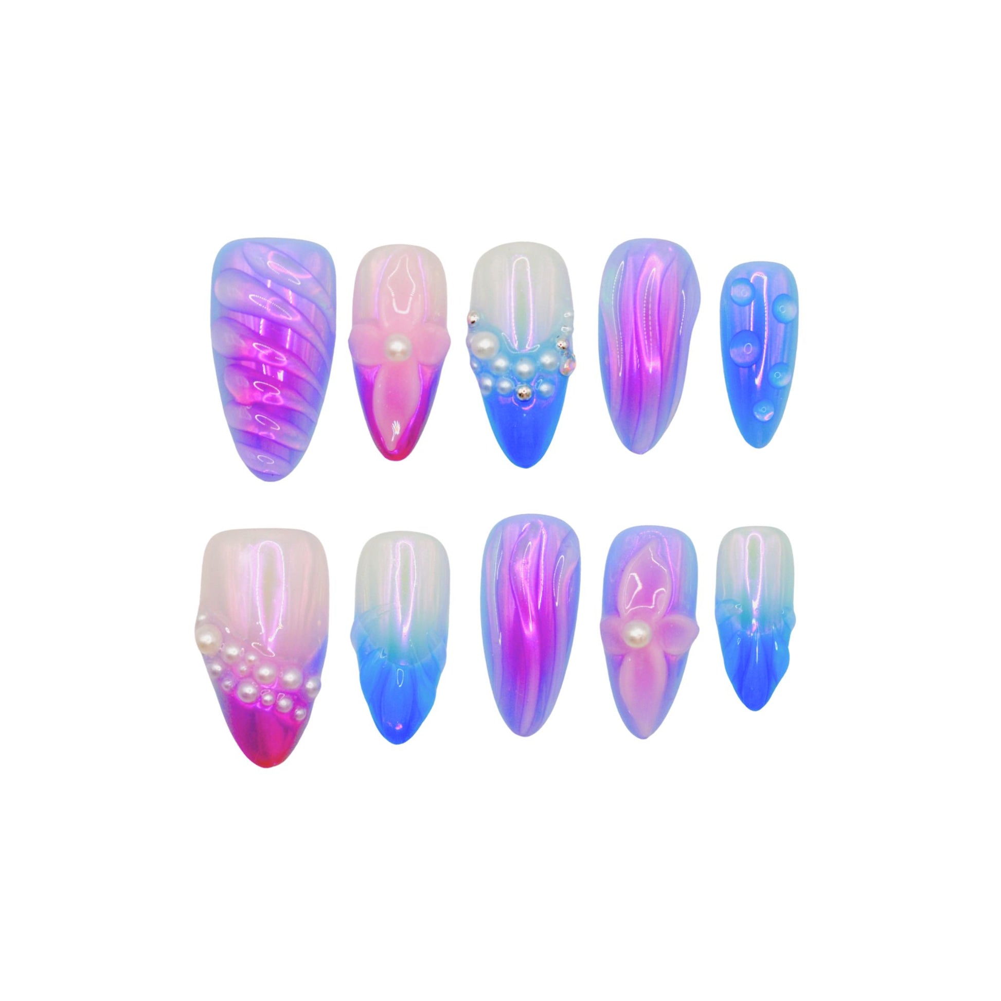 Bloom with elegance wearing Siréna press-on nails from Solèa. This premium set blends decorative elements, including small pearls and 3D floral accents in pink and white, adding a touch of elegance and intricacy. The shapes are predominantly almond, with smooth, polished surfaces that enhance the overall luxurious and creative look.