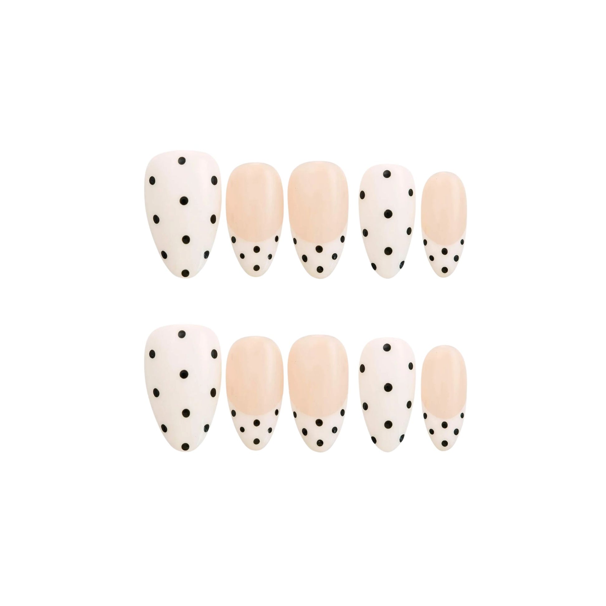 This premium set features an almond-shaped design with a soft cream and nude canvas, bold black polka dots dance across the nails—varying in size for a dynamic, eye-catching rhythm.