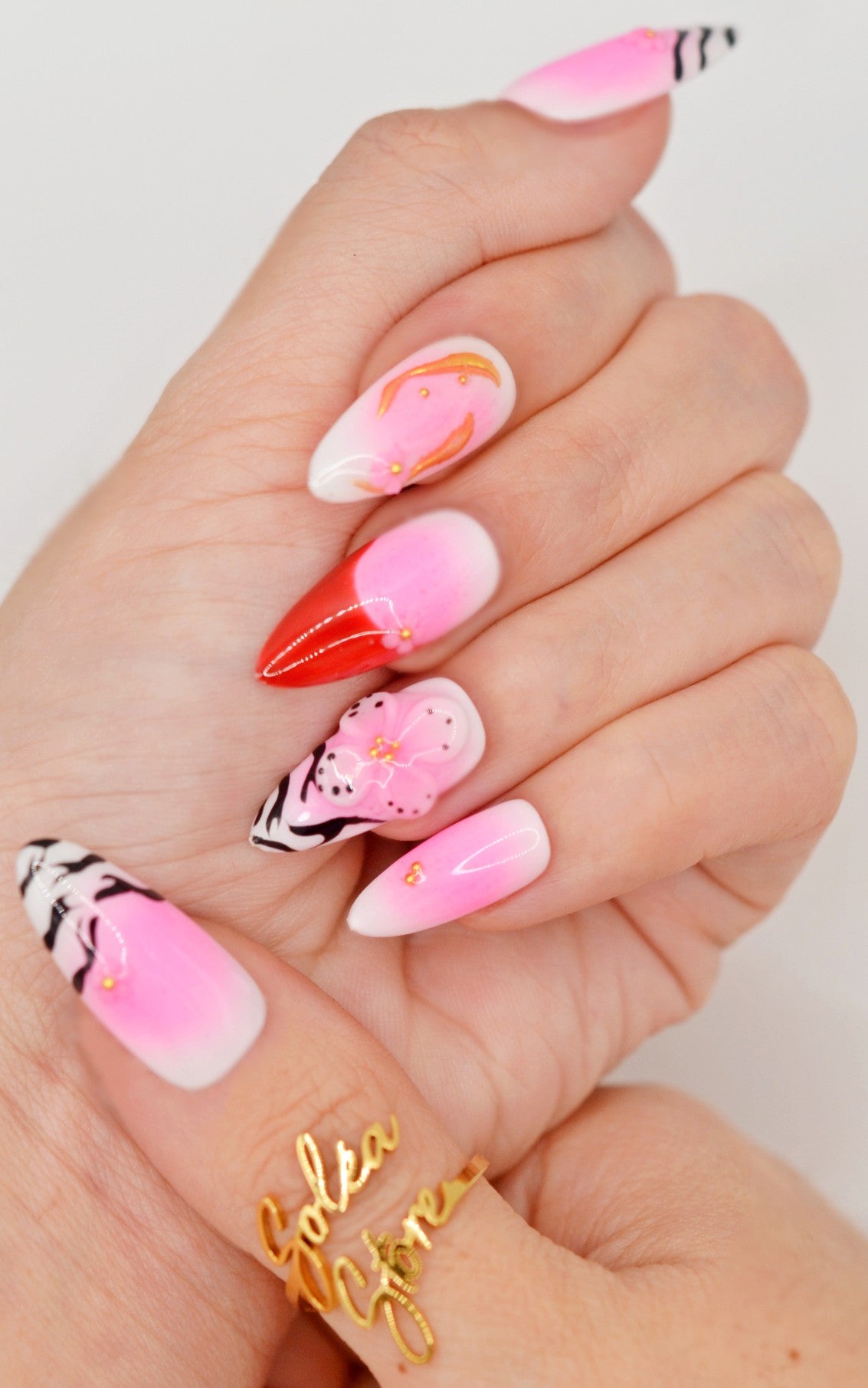 This premium set features an almond shape with a gradient base transitioning from nude to pink, with some nails incorporating bold red tips. Several nails are adorned with black and white zebra-stripe patterns, 3D pink floral embellishments, and gold bead or swirl accents. The overall style is vibrant and eclectic, blending animal print with delicate floral and metallic details.