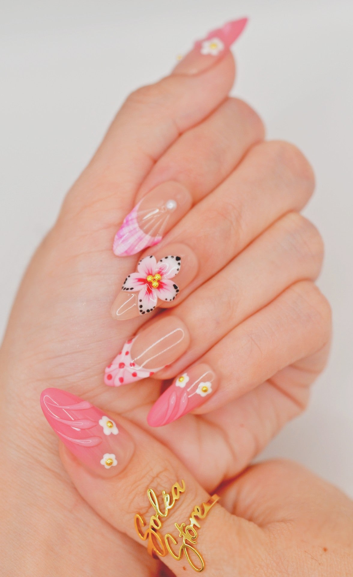 This premium set features, an almond-shaped design with a gradient base color transitioning from a soft peach to a vibrant pink. The decorations include white and pink floral patterns, some with gold accents, as well as 3D flower embellishments. Additional details include polka dots, wavy lines, and small pearls, giving the nails a playful and elegant look.