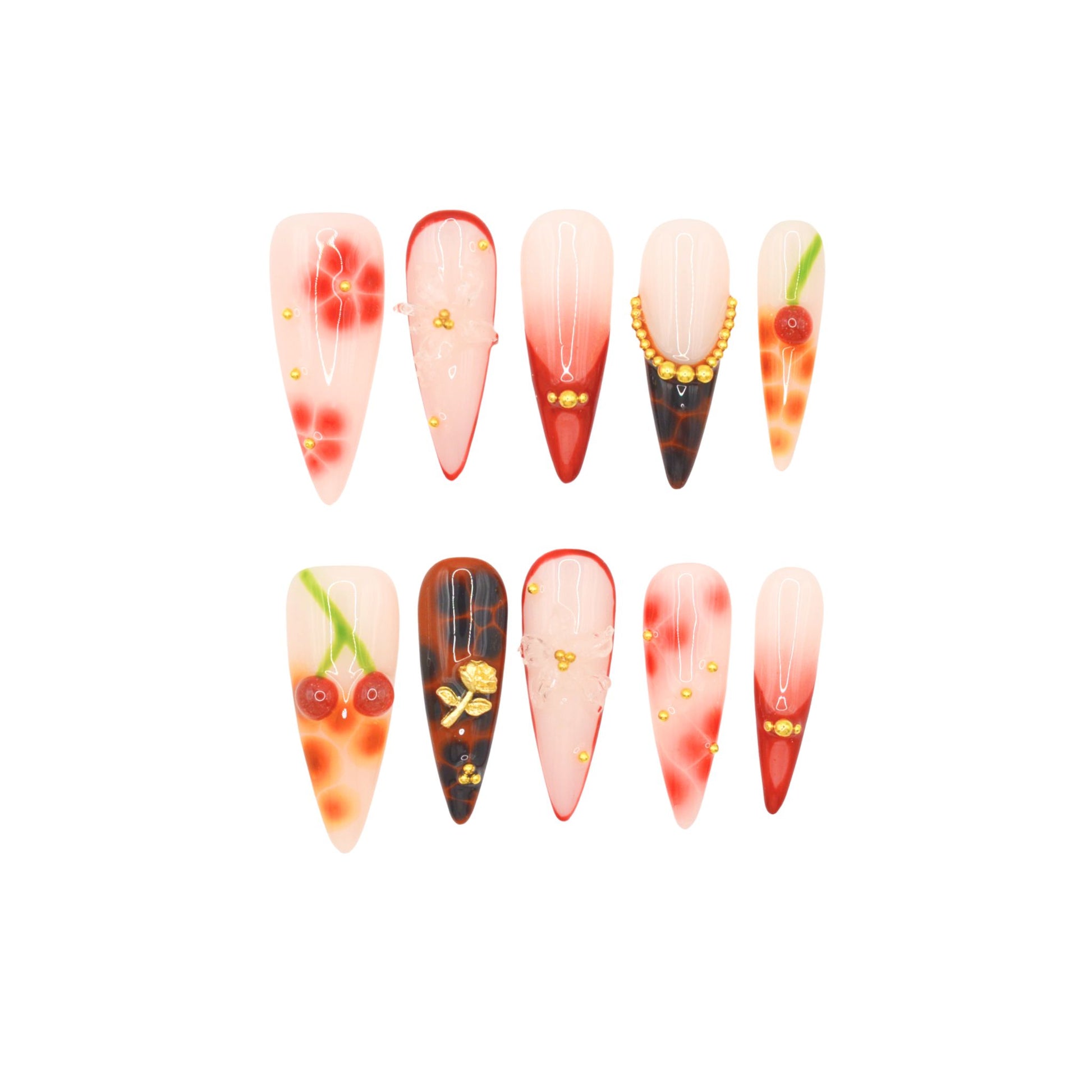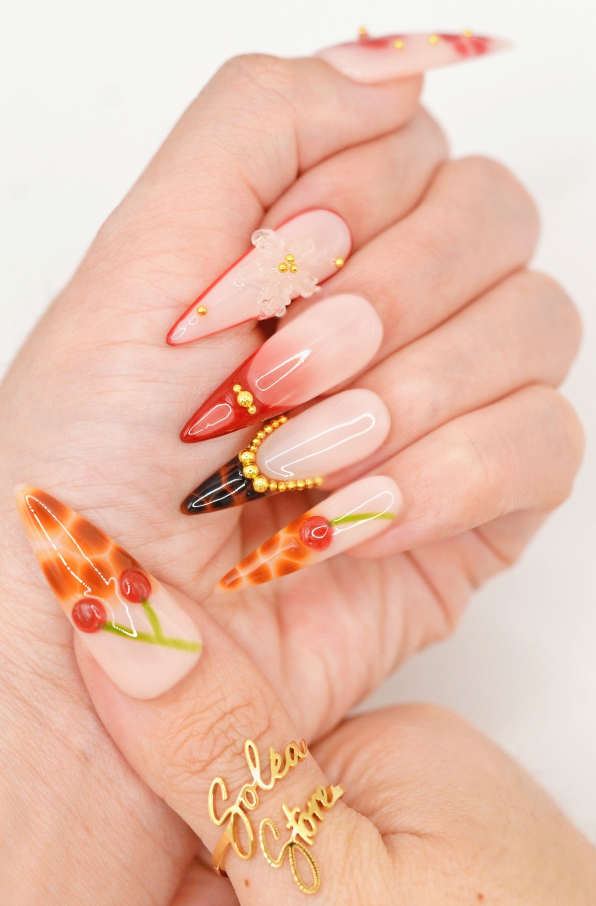 This premium set features an almond shape with a gradient base transitioning from nude to deep red, with some nails showcasing a leopard-spot pattern in brown and orange. Several nails are adorned with 3D embellishments, including cherry motifs with green stems, gold chains with beads, and floral accents. The overall style is bold and luxurious, blending animal print with vibrant decorative elements.
