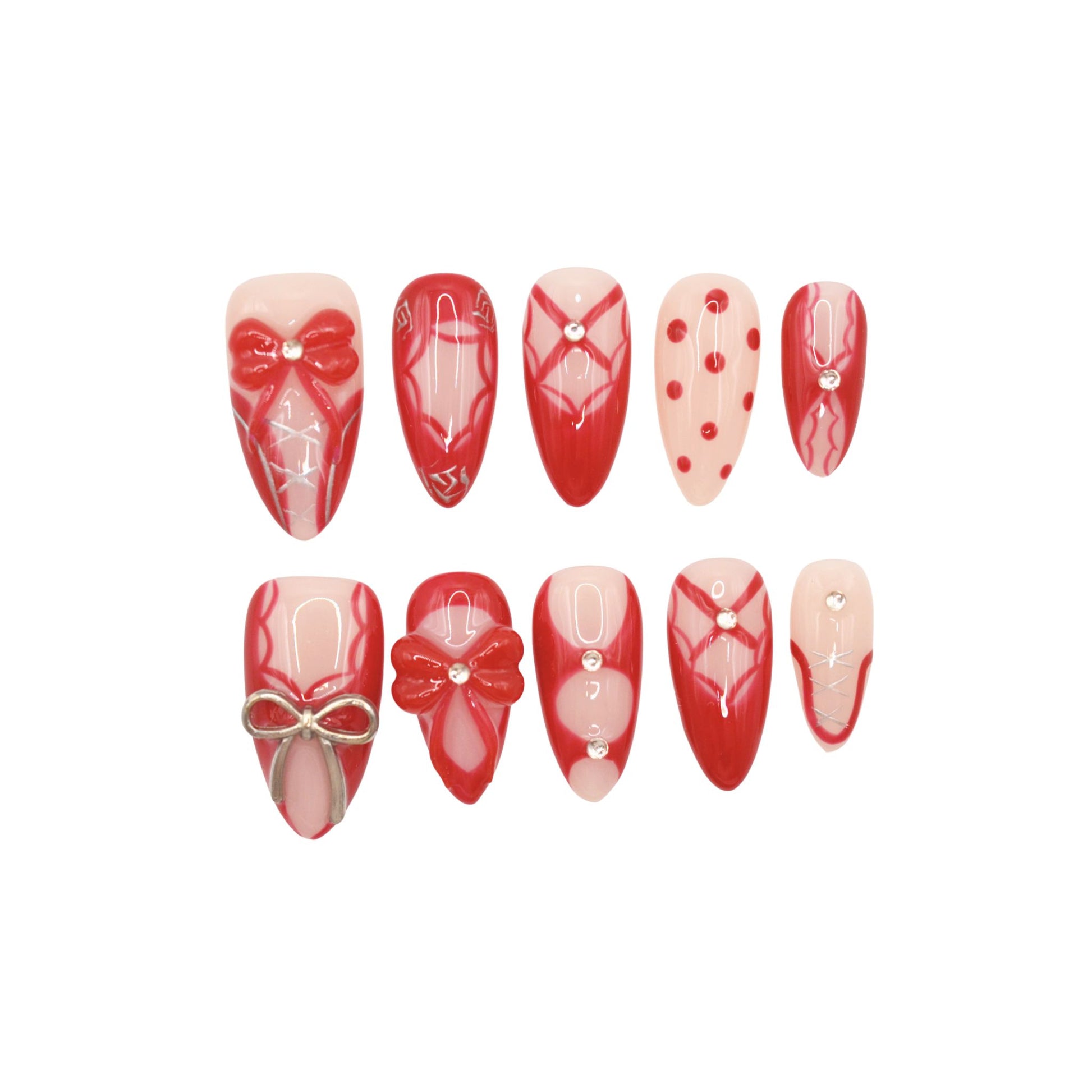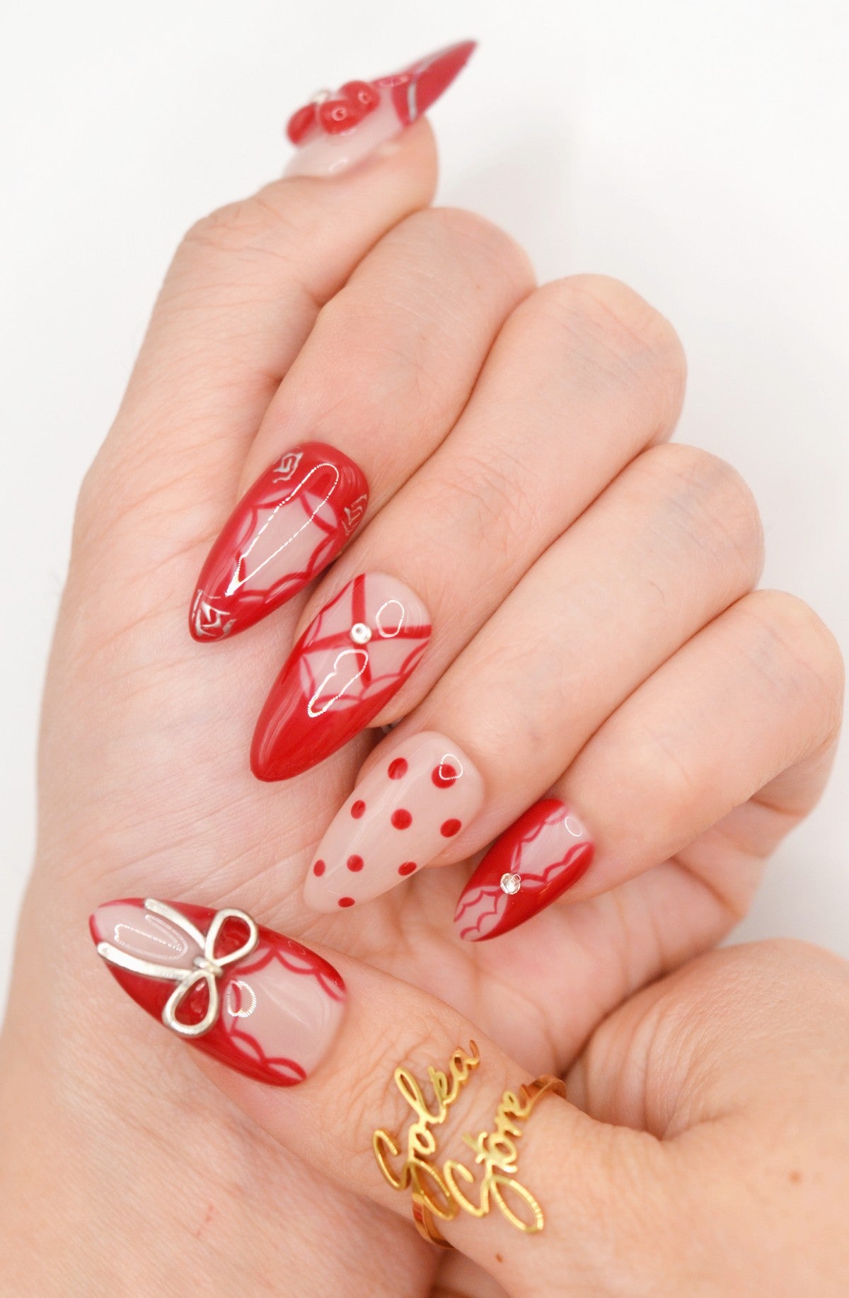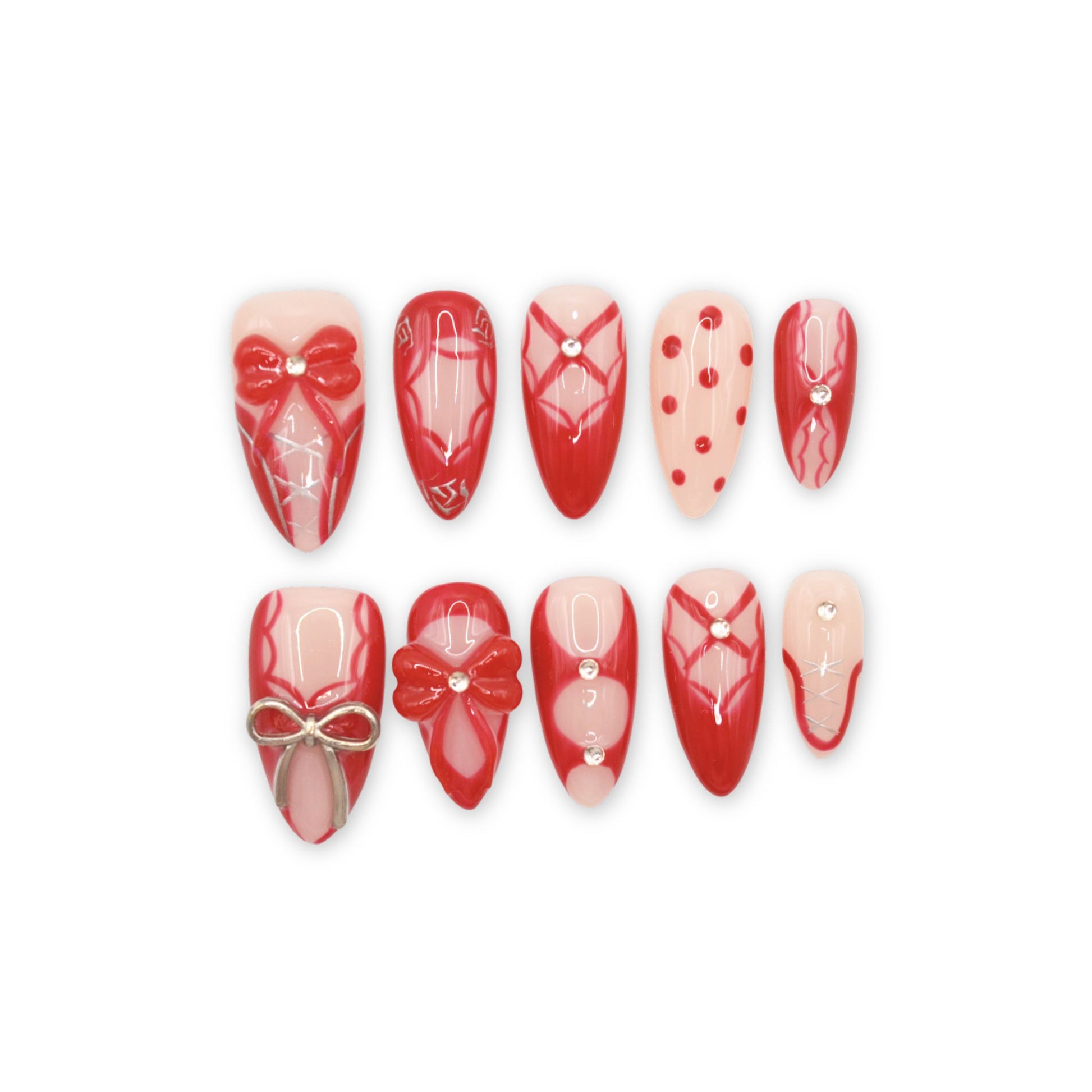 This premium set features an almond shape with a romantic and elegant design. The nails are predominantly red, with a gradient fade to nude at the base. Several nails are decorated with 3D bow motifs in red, accented with rhinestones and metallic details. Others feature crisscross patterns resembling lace or corset ties, along with polka dots and additional rhinestone embellishments. The overall style is feminine and ornate, ideal for a special occasion manicure.