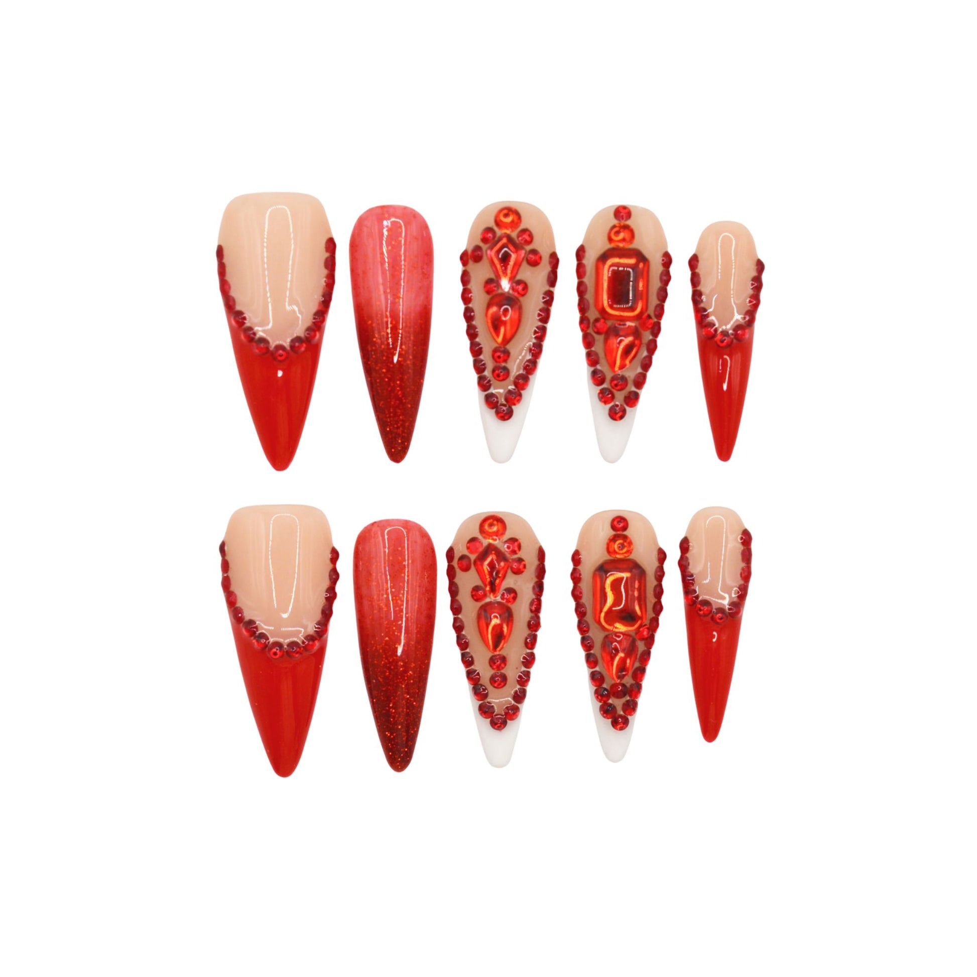 Bloom with elegance wearing Rubina press-on nails from Solèa. This premium set showcases a bold and glamorous design with a predominant red color scheme, featuring a gradient effect that transitions from a deep red tip to a lighter base. The stiletto-shaped nails are adorned with intricate detailing, including rows of small red gemstones lining the edges and center. Some nails feature larger, rectangular red jewels as focal points, adding a luxurious touch. The glossy finish and glitter accents enhance the vibrant, eye-catching look.
