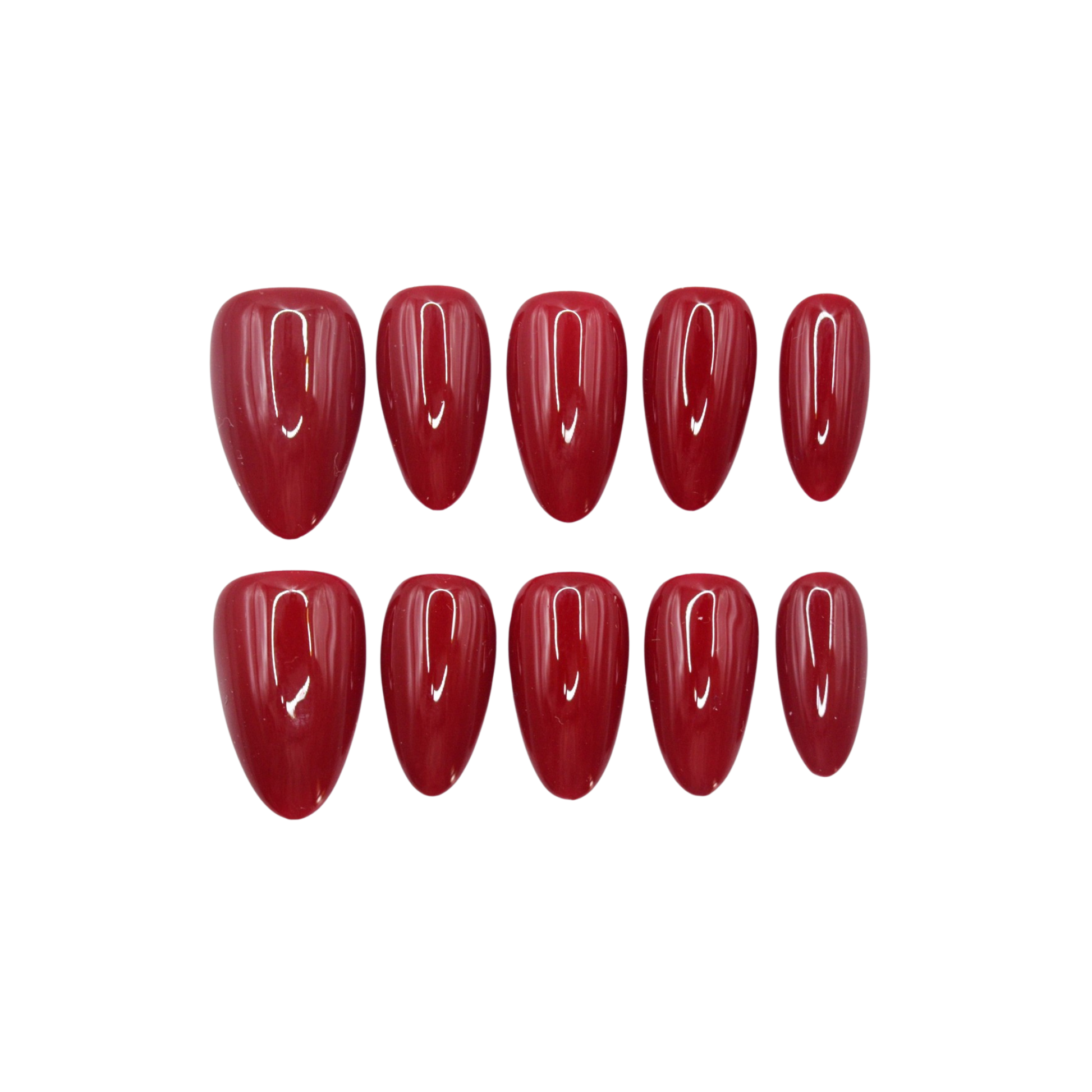 This premium set features, an almond-shaped design featuring a glossy red finish. The nails are arranged in two rows, with varying sizes to fit different fingers. They have a smooth, almond-shaped design, which is a popular style for nail enhancements.