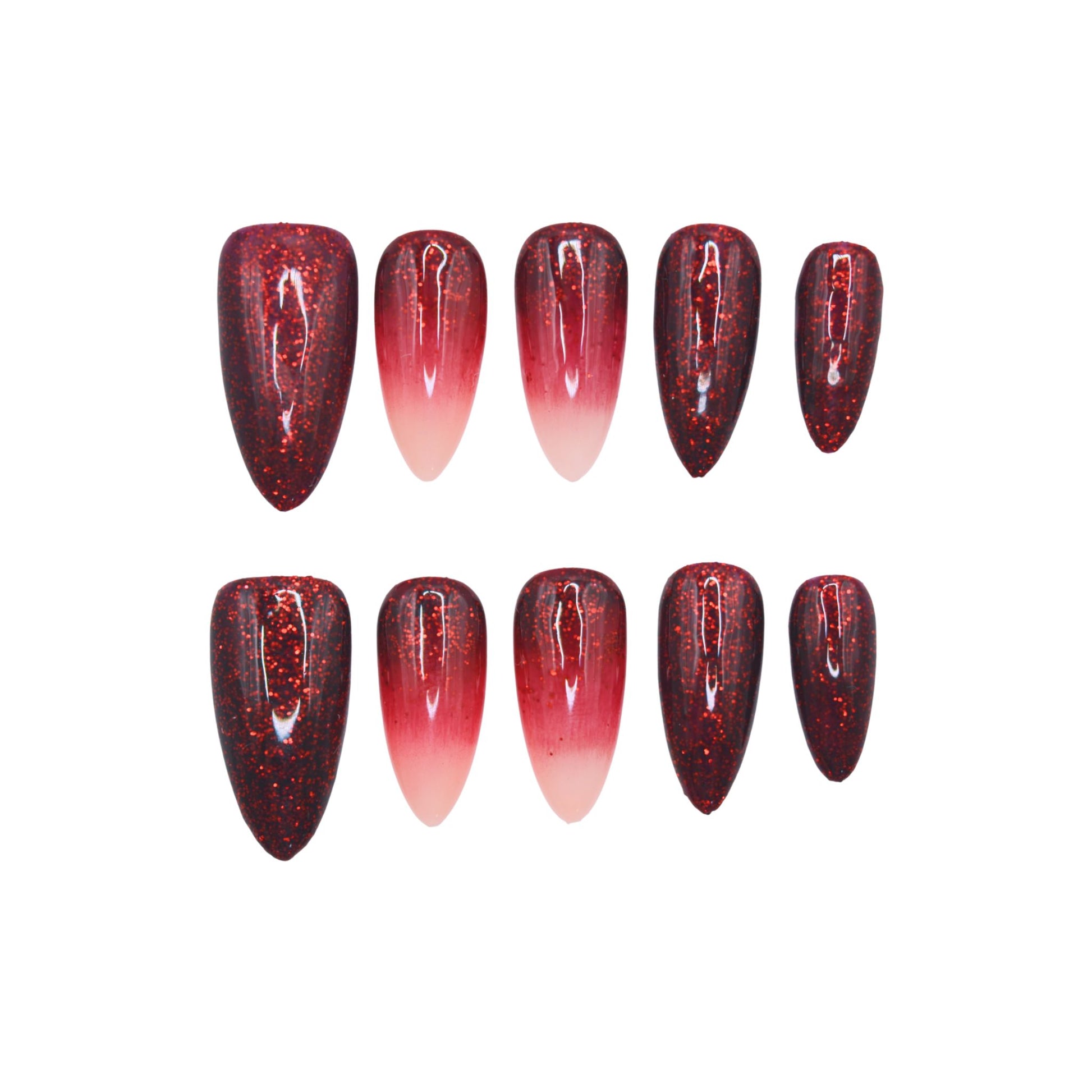 This premium set features an almond shape with a striking gradient design, transitioning from a deep red glitter base to a soft pink tip. The glittery finish adds a dazzling, festive touch, enhancing the bold and elegant look.