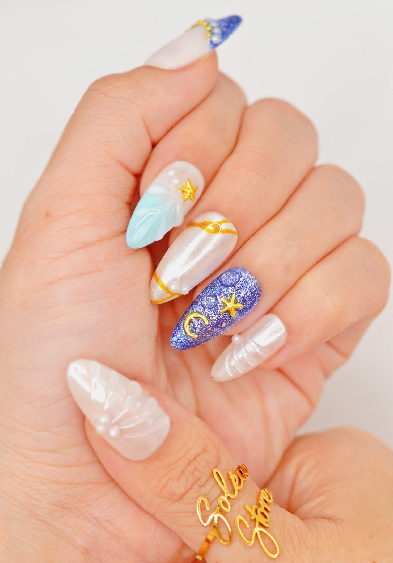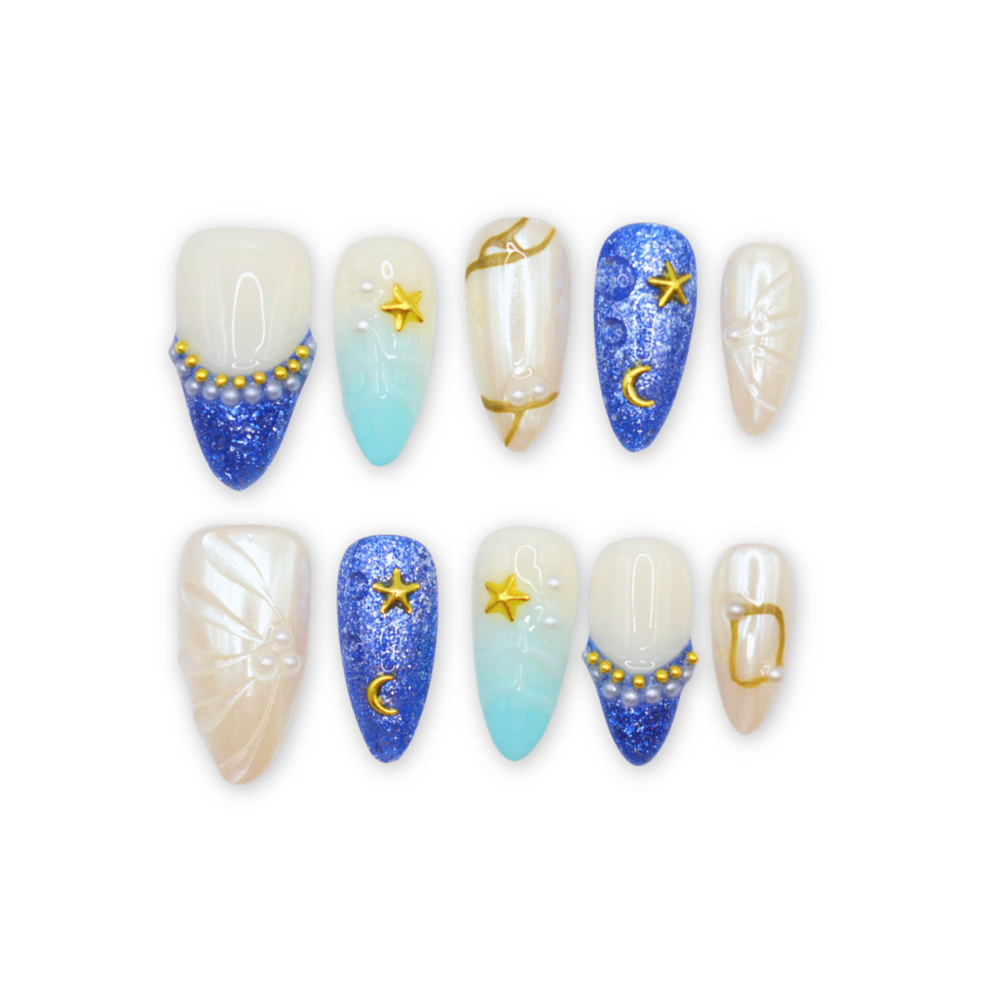 This premium set features an almond shape with a gradient from white to blue with a glittery finish, while others are solid white with a pearlescent sheen. Decorative elements include gold stars, crescent moons, and small pearls, with some nails accented by gold chains or lines. The glossy finish enhances the celestial and elegant aesthetic.