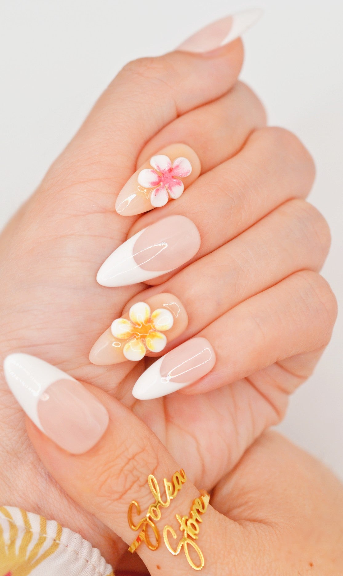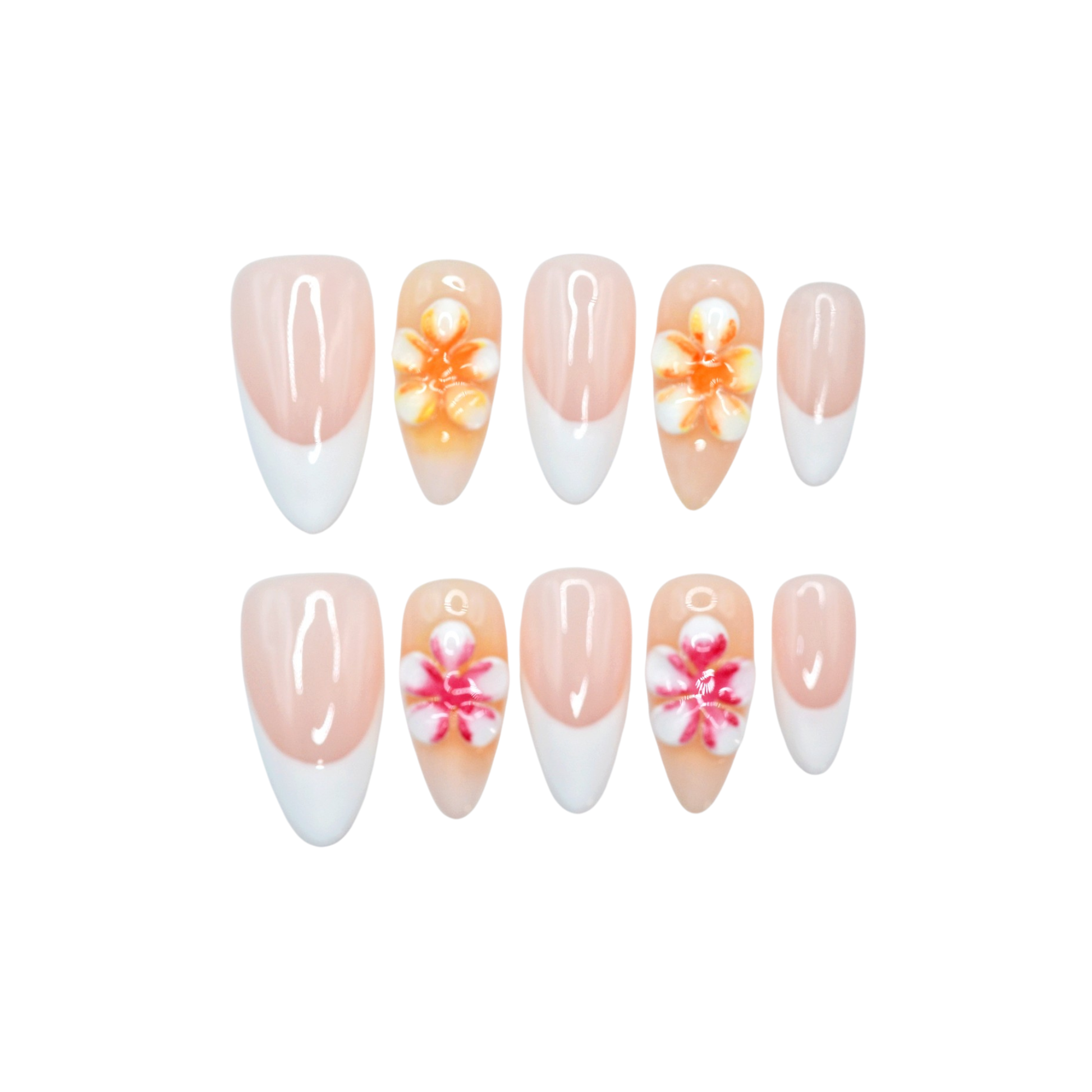 This premium set features, an almond-shaped design featuring a French manicure design with a nude base and white tips. Some nails are decorated with colorful floral designs, including orange and pink flowers, adding a vibrant touch. The nails are arranged in two rows with varying sizes to fit different fingers, and they have a smooth, almond-shaped design.