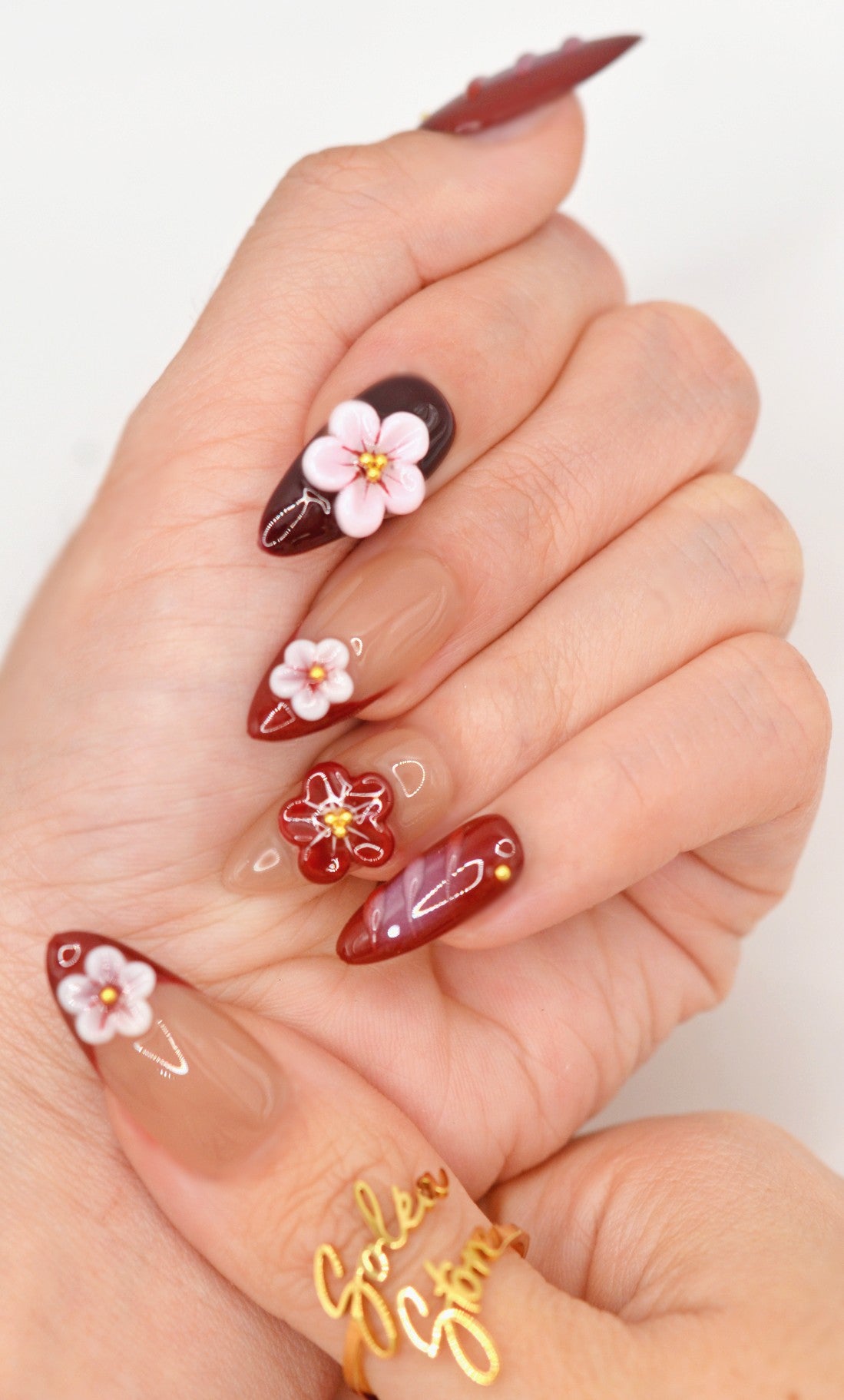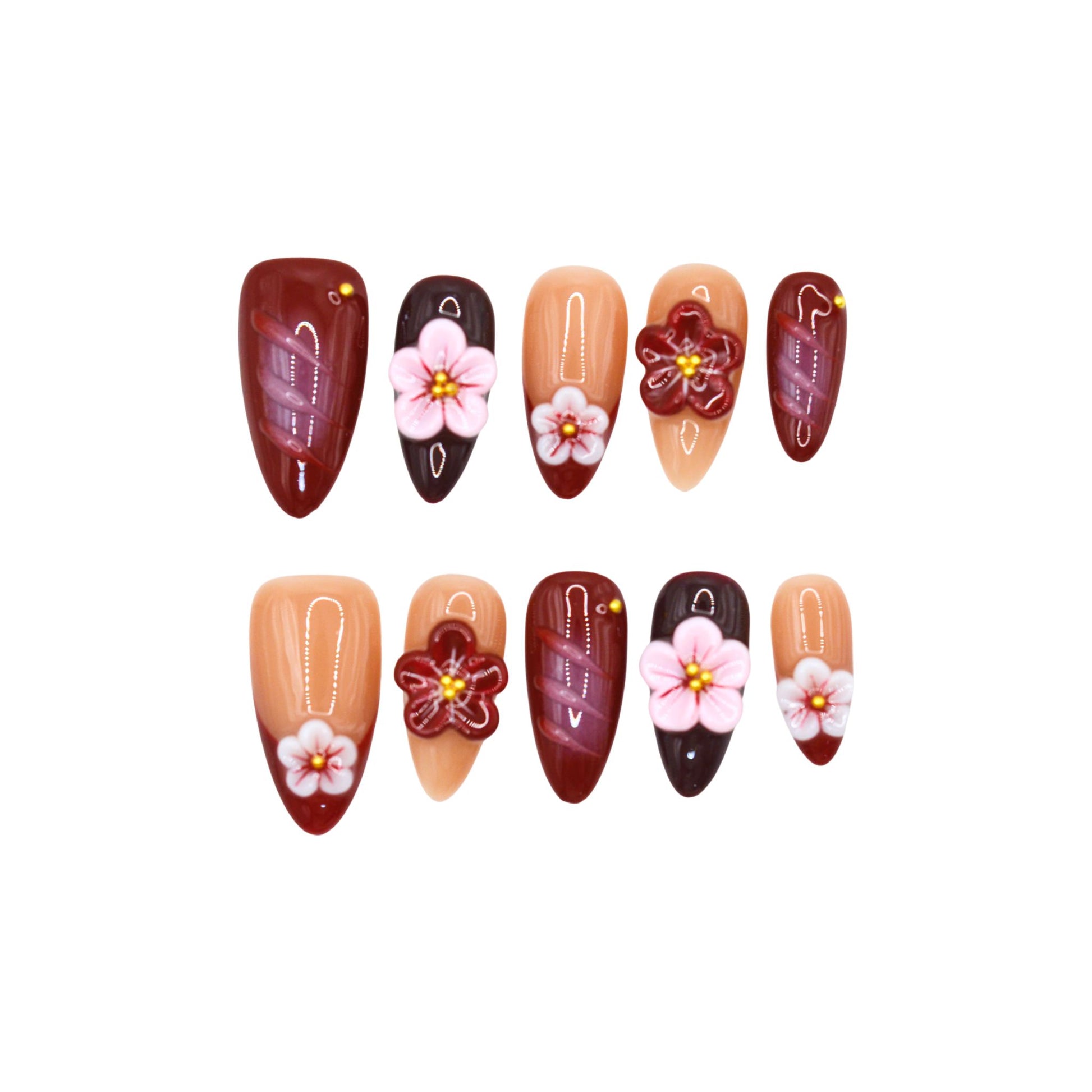 This premium set features an almond shape with a gradient design transitioning from a nude base to a deep maroon tip. Many nails showcase a swirled pattern in shades of maroon and pink. Each nail is adorned with a 3D floral accent in pink and white with yellow centers, adding a delicate and elegant touch. The glossy finish enhances the rich and sophisticated look.